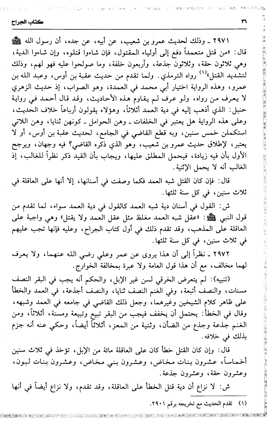 2971 وذلك لحديث عمرو بن شعيب ، عن أبيه ، عن جده ، أن رسول الله قال : ( من قتل متعمداً دفع إلى أولياء المقتول ، فإن شاءوا قتلوه ، وإن شاءوا الدية ، وهي ثلاثون حقة ، وثلاثون جذعة ، وأربعون خلفة ، وما صولحوا عليه فهو لهم ، وذلك لتشديد القتل ) رواه الترمذي . ولما تقدم من حديث عقبة بن أوس ، وعبد الله بن عمرو ، وهذه الرواية اختيار أبي محمد في العمدة ، وهو الصواب ، إذ حديث الزهري لا يعرف من رواه ، ولو عرف لم يقاوم هذه الأحاديث ، وقد قال أحمد في رواية حنبل : الذي أذهب إليه في دية العمد أثلاثاً ، وهؤلاء يقولون أرباعاً خلاف الحديث ، وعلى هذه الرواية هل يعتبر في الخلفات وهن الحوامل كونهن ثنايا ، وهن اللاتي استكملن خمس سنين ، وبه قطع القاضي في الجامع ، لحديث عقبة بن أوس ، أو لا يعتبر ، لإطلاق حديث عمرو بن شعيب ، وهو الذي ذكره القاضي ؟ فيه وجهان ، ويرجح الأول بأن فيه زيادة ، فيحمل المطلق عليها ، ويجاب بأن القيد ذكر نظراً للغالب ، إذ الغالب أنه لا يحمل الإثنية .