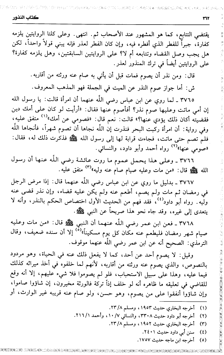 3767 بدليل ما روي عن ابن عباس رضي اللَّه عنهما قال : إذا مرض الرجل في رمضان ثم مات ولم يصم ، أطعم عنه ولم يكن عليه قضاء ، وإن نذر قضى عنه وليه . رواه أبو داود ، فقد فهم من الحديث الأول اختصاص الحكم بالنذر ، وأنه لا يتعدى إلى غيره ، وقد جاء نحو هذا صريحاً عن النبي .