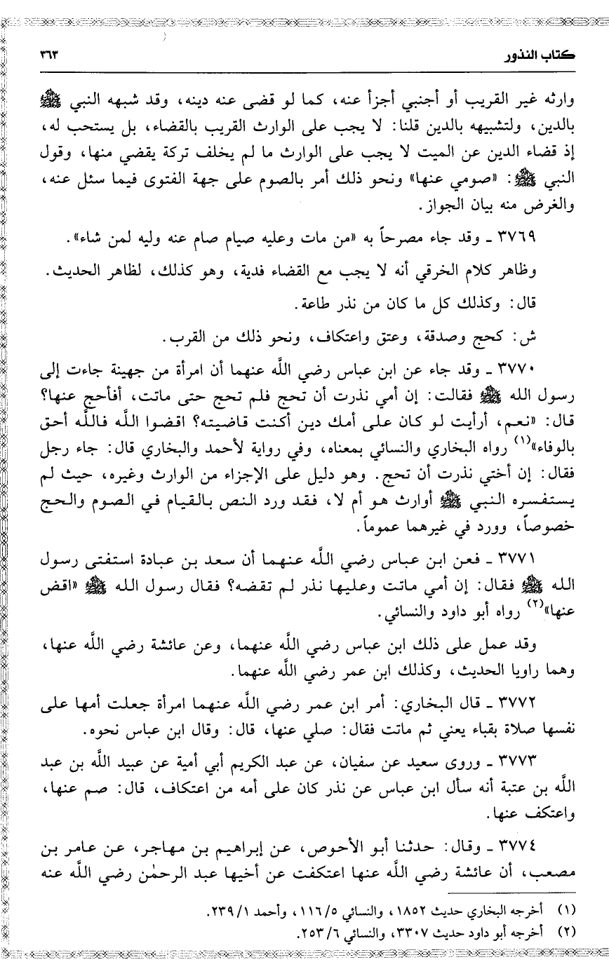 3770 وقد جاء عن ابن عباس رضي اللَّه عنهما أن امرأة من جهينة جاءت إلى رسول اللَّه فقالت : إن أمي نذرت أن تحج فلم تحج حتى ماتت ، أفأحج عنها ؟ قال : ( نعم ، أرأيت لو كان على أمك دين أكنت قاضيته ؟ اقضوا اللَّه فاللَّه أحق بالوفاء ) رواه البخاري والنسائي بمعناه ، وفي رواية لأحمد والبخاري قال : جاء رجل فقال : إن أختي نذرت أن تحج . وهو دليل على الإجزاء من الوارث وغيره ، حيث لم يستفسره النبي أوارث هو أم لا ، فقد ورد النص بالقيام في الصوم والحج خصوصاً ، وورد في غيرهما عموماً .