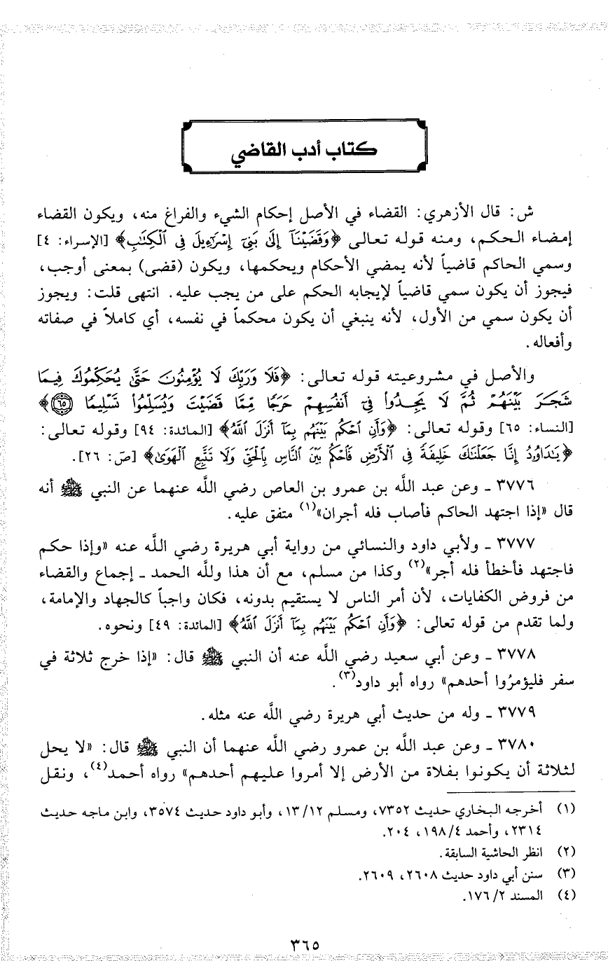 3777 ولأبي داود والنسائي من رواية أبي هريرة رضي اللَّه عنه ( وإذا حكم فاجتهد فأخطأ فله أجر ) وكذا من مسلم ، مع أن هذا وللَّه الحمد إجماع والقضاء من فروض الكفايات ، لأن أمر الناس لا يستقيم بدونه ، فكان واجباً كالجهاد والإمامة ، ولما تقدم من قوله تعال : [ ب 2 ] 19 ( { وأن احكم بينهم بما أنزل اللَّه } ) [ ب 1 ] ونحوه .