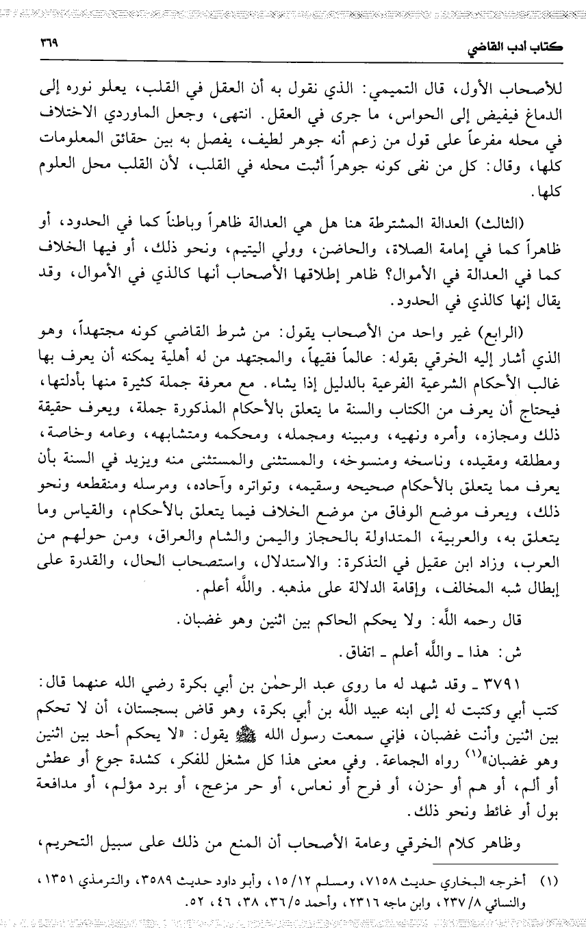 3791 وقد شهد له ما روى عبد الرحمن بن أبي بكرة رضي الله عنهما قال : كتب أبي وكتبت له إلى ابنه عبيد اللَّه بن أبي بكرة ، وهو قاض بسجستان ، أن لا تحكم بين اثنين وأنت غضبان ، فإني سمعت رسول اللَّه يقول : ( لا يحكم أحد بين اثنين وهو غضبان ) رواه الجماعة . وفي معنى هذا كل مشغل للفكر ، كشدة جوع أو عطش أو ألم ، أو هم أو حزن ، أو فرح أو نعاس ، أو حر مزعج ، أو برد مؤلم ، أو مدافعة بول أو غائط ونحو ذلك .