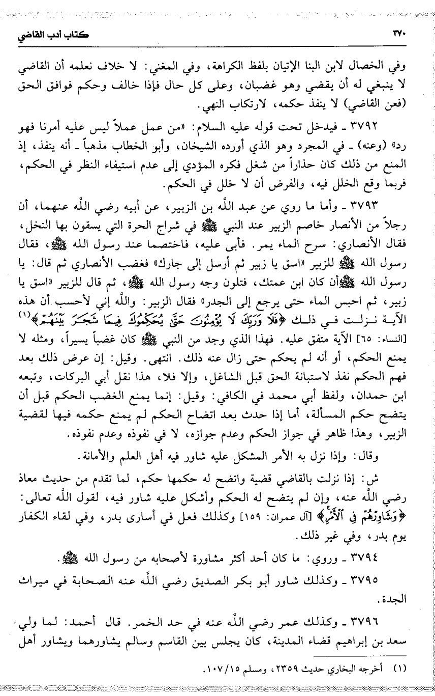1793 وأما ما روي عن عبد اللَّه بن الزبير ، عن بيه رضي اللَّه عنهما ، أن رجلاً من الأنصار خاصم الزبير عند النبي في شراج الحرة التي يسقون بها النخل ، فقال الأنصاري : سرح الماء يمر . فأبى عليه ، فاختصما عند رسول اللَّه ، فقال رسول اللَّه للزبير ( اسق يا زبير ثم أرسل إلى جارك ) فغضب الأنصاري ثم قال : يا رسول اللَّه أن كان ابن عمتك ، فتلون وجه رسول اللَّه ، ثم قال للزبير ( اسق يا زبير ، ثم احبس الماء حتى يرجع إلى الجدر ) فقال الزبير : واللَّه إني لأحسب أن هذه الآية نزلت في ذلك [ ب 2 ] 19 ( { فلا وربك لا يؤمنون حتى يحكموك فيما شجر بينهم } ) [ ب 1 ] الآية متفق عليه . فهذا الذي وجد من النبي كان غضباً يسيراً ، ومثله لا يمنع الحكم ، أو أنه لم يحكم حتى زال عنه ذلك . انتهى . وقيل : إن عرض ذلك بعد فهم الحكم نفذ لاستبانة الحق قبل الشاغل ، وإلا فلا ، هذا نقل أبي البركات ، وتبعه ابن حمدان ، ولفظ أبي محمد في الكافي : وقيل : إنما يمنع الغضب الحكم قبل أن يتضح حكم المسألة ، أما إذا حدث بعد اتضاح الحكم لم يمنع حكمه فيها لقضية الزبير ، وهذا ظاهر في جواز الحكم وعدم جوازه ، لا في نفوذه وعدم نفوذه .