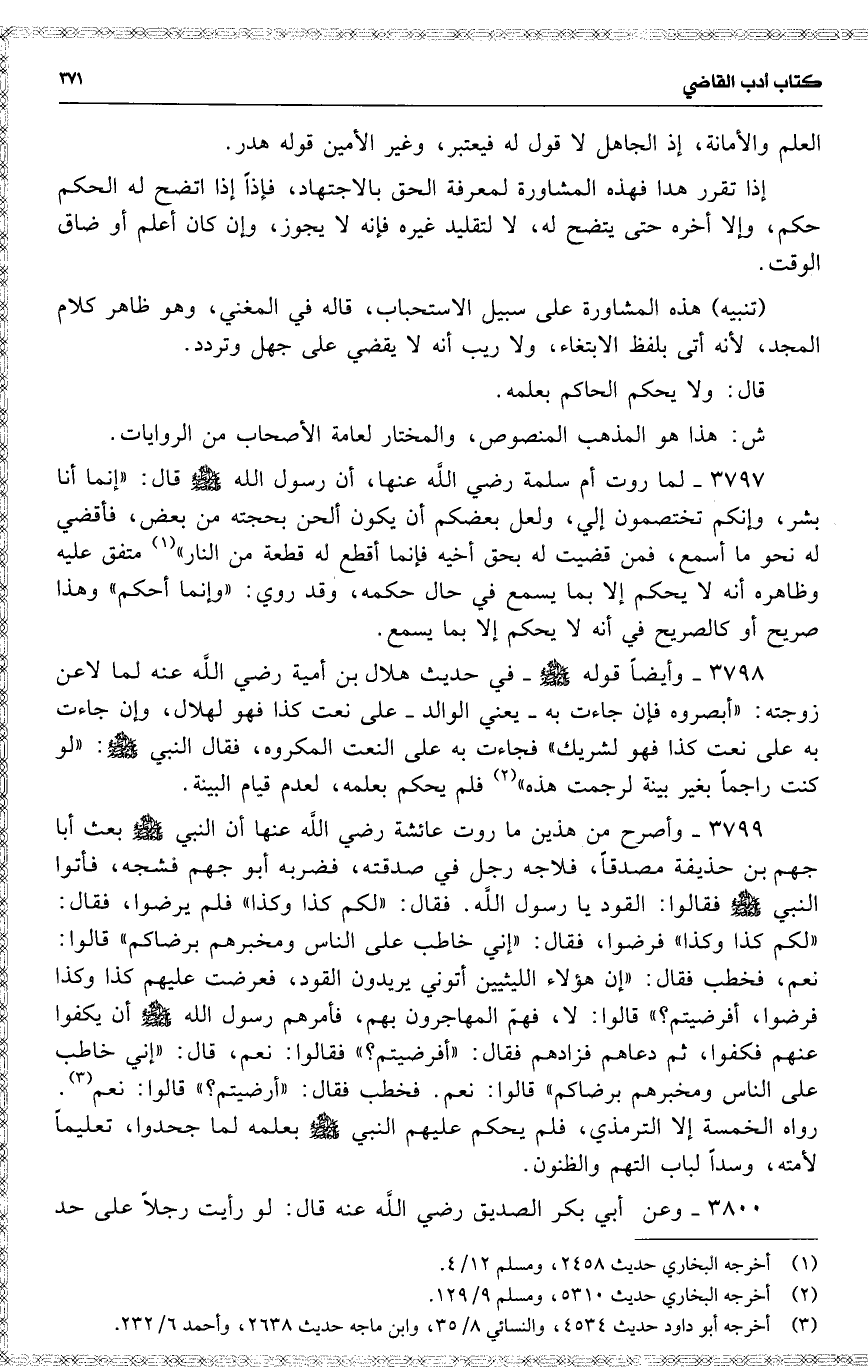 3799 وأصرح من هذين ما روت عائشة رضي اللَّه عنها أن النبي بعث أبا جهم بن حذيفة مصدقاً ، فلاجه رجل في صدقته ، فضربه أبو جهم فشجه ، فأتوا النبي فقالوا : القود يا رسول اللَّه . فقال : ( إني خاطب على الناس ومخبرهم برضاكم ) قالوا : نعم ، فخطب فقال : ( إن هؤلاء الليثيين أتوني يريدون القود ، فعرضت عليهم كذا وكذا فرضوا ، أفرضيتم ) ؟ قالوا : لا ، فهمّ المهاجرون بهم ، فأمرهم رسول اللَّه أن يكفوا عنهم فكفوا ، ثم دعاهم فزادهم فقال : ( أفرضيتم ؟ ) فقالوا : نعم ، قال : ( إني خاطب على الناس ومخبرهم برضاكم ) قالوا : نعم . فخطب فقال : ( أرضيتم ؟ ) قالوا : نعم . رواه الخمسة إلا الترمذي ، فلم يحكم عليهم النبي بعلمه لما جحدوا ، تعليماً لأمته ، وسداً لباب التهم والظنون .