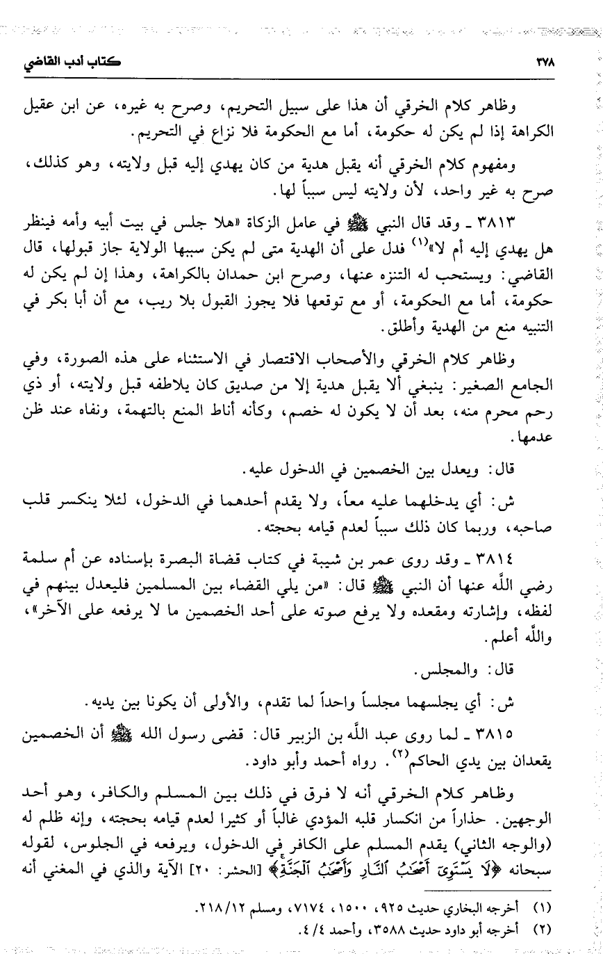 3815 لما روى عبد اللَّه بن الزبير قال : قضى رسول اللَّه أن الخصمين يقعدان بين يدي الحاكم . رواه أحمد وأبو داود .