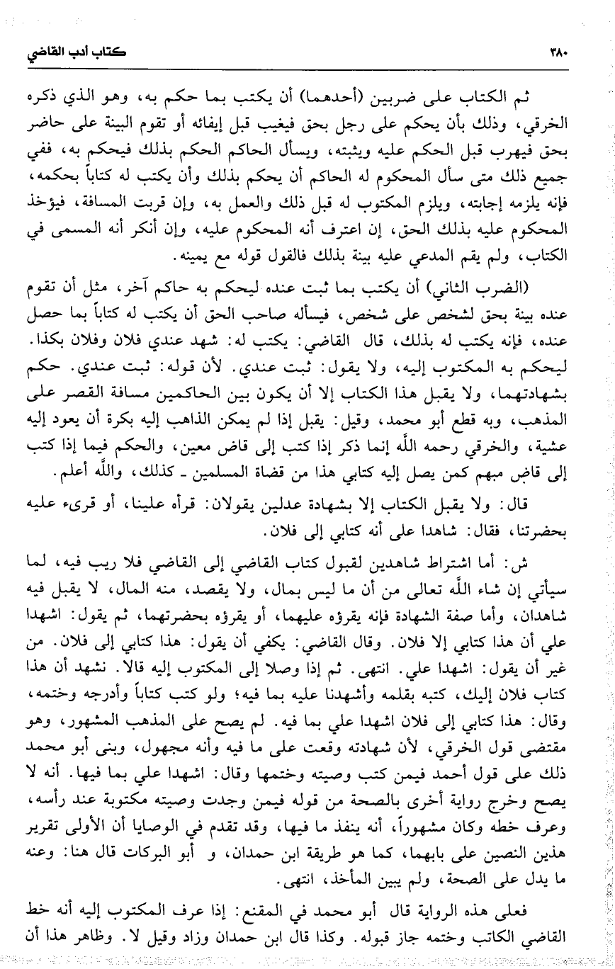 ثم الكتاب على ضربين ( أحدهما ) أن يكتب بما حكم به ، وهو الذي ذكره الخرقي ، وذلك بأن يحكم على رجل بحق فيغيب قبل إيفائه أو تقوم البينة على حاضر بحق فيهرب قبل الحكم عليه ويثبته ، ويسأل الحاكم الحكم بذلك فيحكم به ، ففي جميع ذلك متى سأل المحكوم له الحاكم أن يحكم بذلك وأن يكتب له كتاباً بحكمه ، فإنه يلزمه إجابته ، ويلزم المكتوب له قبل ذلك والعمل به ، وإن قربت المسافة ، فيؤخذ المحكوم عليه بذلك الحق ، إن اعترف أنه المحكوم عليه ، وإن أنكر أنه المسمى في الكتاب ، ولم يقم المدعي عليه بينة بذلك فاقول قول مع يمينه .