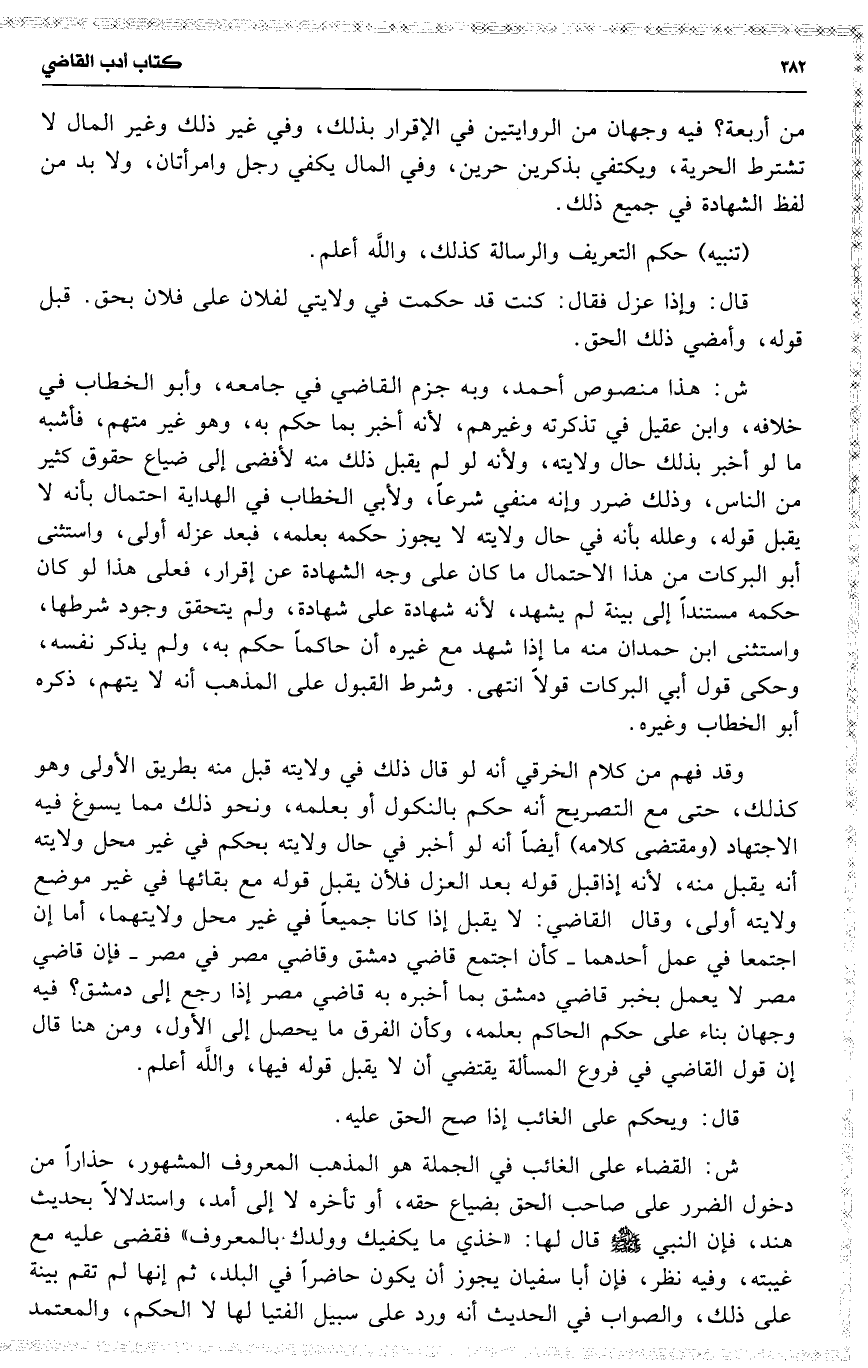 ش : القضاء على الغائب في الجملة هو المذهب المعروف المشهور ، حذاراً من دخول الضرر على صاحب الحق بضياع حقه ، أو تأخر لا إلى أمد ، واستدلالاً بحديث هند ، فإن النبي قال لها : ( خذي ما يكفيك وولدك بالمعروف ) فقضى عليه مع غيبته ، وفيه نظر ، فإن أبا سفيان يجوز أن يكون حاضراً في البلد ، ثم إنها لم تقم بينة على ذلك ، والصواب في الحديث أنه ورد على سبيل الفتيا لها لا الحكم ، والمعتمد