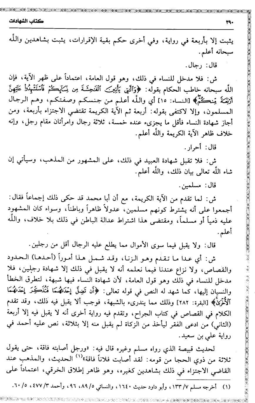 ش : فلا مدخل للنساء في ذلك ، وهو قول العامة ، اعتماداً على ظهر الآية ، فإن اللَّه سبحانه خاطب الحكام بقوله : [ ب 2 ] 19 ( { واللاتي يأتين الفاحشة من نسائكم فاستشهدوا عليهن أربعة منكم } ) [ ب 1 ] أي واللَّه أعلم من جنسكم وصفتكم ، وهم الرجال المسلمون ، وإلا لاكتفى بقوله : أربعة ثم الآية الكريمة تقتضي الاجتزاء بأربعة ، ومن أجاز شهادة النساء فأقل ما يجزىء عنده خمسة ، ثلاثة رجال وامرأتان مقام رجل ، وإنه خلاف ظاهر الآية الكريمة واللَّه أعلم .