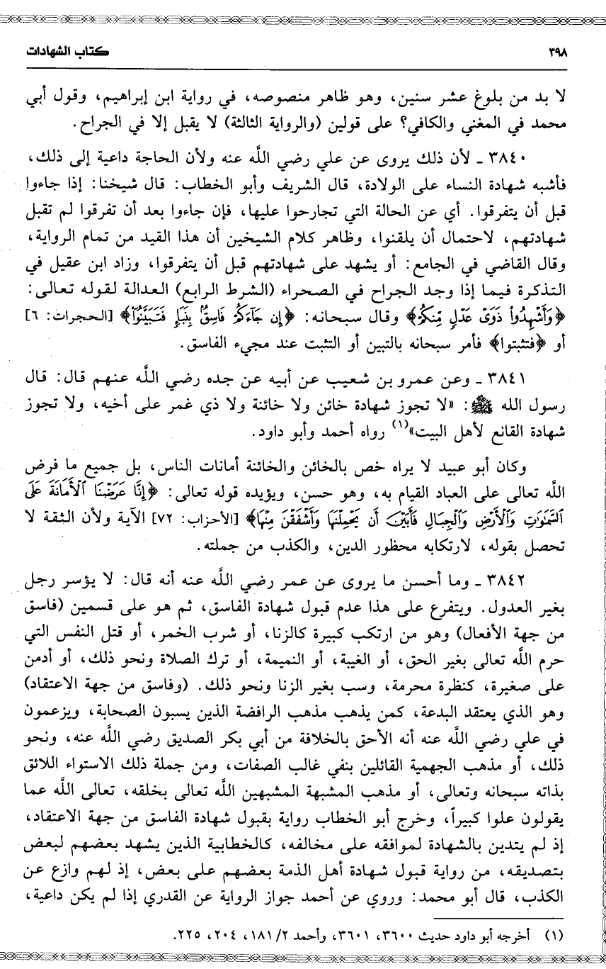 3842 وما أحسن ما يروى عن عمر رضي اللَّه عنه أنه قال : لا يؤسر رجل بغير العدول . ويتفرع على هذا عدم قبول شهادة الفاسق ، ثم هو على قسمين ( فاسق من جهة الأفعال ) وهو من ارتكب كبيرة كالزنا ، أو شرب الخمر ، أو قتل النفس التي حرم اللَّه تعالى بغير الحق ، أو الغيبة ، أو النميمة ، أو ترك الصلاة ونحو ذلك ، أو أدمن على صغيرة ، كنظرة محرمة ، وسب بغير الزنا ونحو ذلك . ( وفاسق من جهة الاعتقاد ) وهو الذي يعتقد البدعة ، كمن يذهب مذهب الرافضة الذين يسبون الصحابة ، ويزعمون في علي رضي اللَّه عنه أنه الأحق بالخلافة من أبي بكر الصديق رضي اللَّه عنه ، ونحو ذلك ، أو مذهب الجهمية القائلين بنفي غالب الصفات ، ومن جملة ذلك الاستواء اللائق بذاته سبحانه وتعالى ، أو مذهب المشبهة المشبهين اللَّه تعالى بخلقه ، تعالى اللَّه عما يقولون علوا كبيراً ، وخرج أبو الخطاب رواية بقبول شهادة الفاسذ من جهة الاعتقاد ، إذ لم يتدين بالشهادة لموافقة على مخالفة ، كالخطابية الذين يشهد بعضهم لبعض بتصديقه ، من رواية قبول شهادة أهل الذمة بعضهم على بعض ، إذ لهم وازع عن الكذب ، قال أبو محمد : وروي عن أحمد جواز الرواية عن القدري إذا لم يكن داعية ،