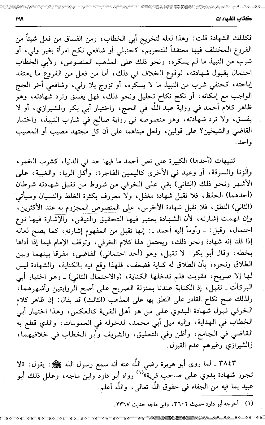 3843 لما روى أبو هريرة رضي اللَّه عنه أنه سمع رسول اللَّه : يقول : ( لا تجوز شهادة بدوي على صاحب قرية ) رواه أبو داود وابن ماجه ، وعلل ذلك أبو عبيد بما فيه من الجفاء في حقوق اللَّه تعالى ، واللَّه أعلم .