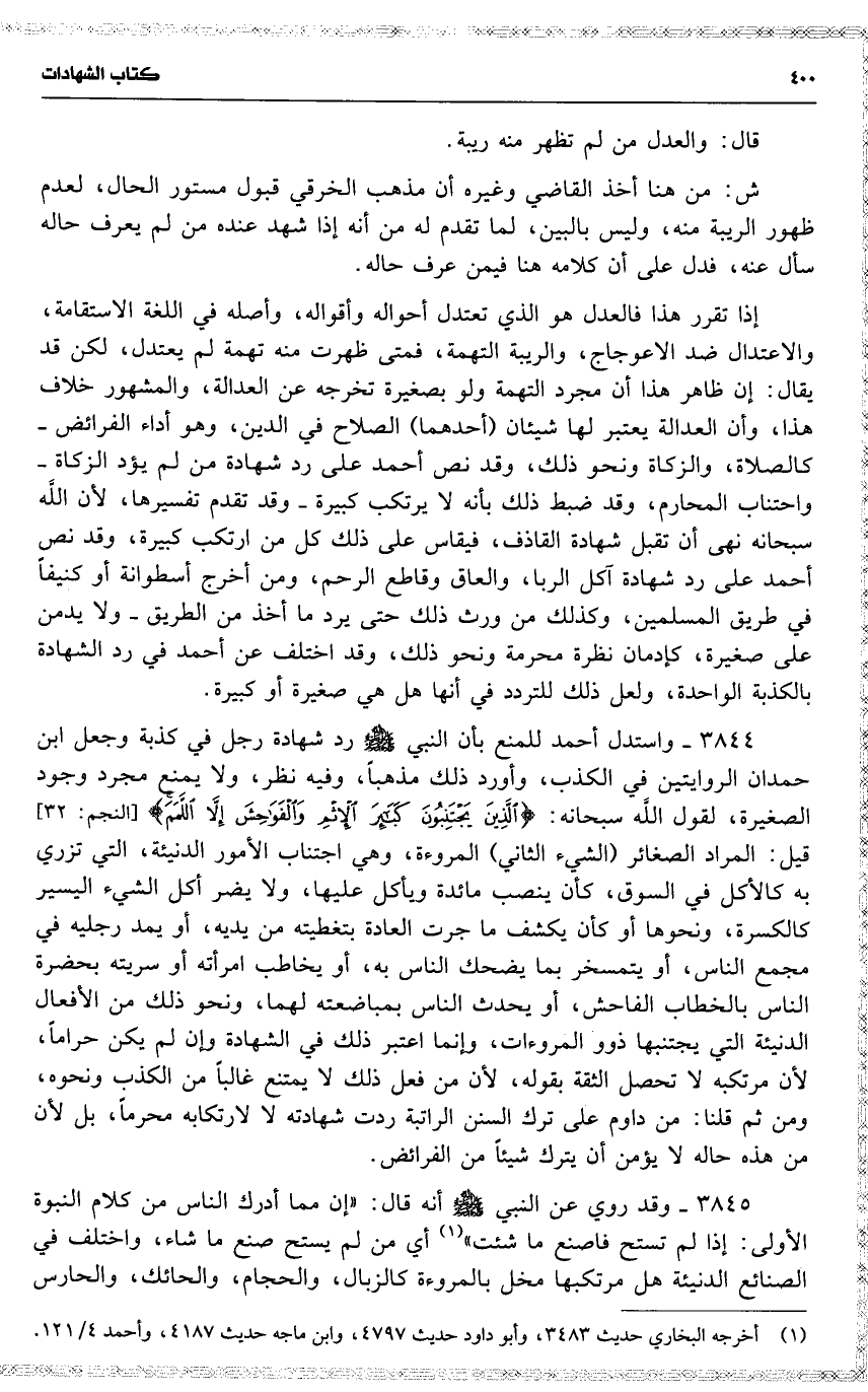 إذا تقرر هذا فالعدل هو الذي تعتدل أحواله وأقواله ، وأصله في اللغة الاستقامة ، والاعتدال ضد الاعوجاج ، والريبة التهمة ، فمتى ظهرت منه تهمة لم يعتدل ، لكن قد يقال : إن ظاهر هذا أن مجرد التهمة ولو بصغيرة تخرجه عن العدالة ، والمشهور خلاف هذا ، وأن العدالة يعتبر لها شيئان ( أحدهما ) الصلاح في الدين ، وهو أداء الفرائض كالصلاة ، والزكاة ونحو ذلك ، وقد نص أحمد على رد شهادة من لم يؤد الزكاة واحتناب المحارم ، وقد ضبط ذلك بأنه لا يرتكب كبيرة وقد تقدم تفسيرها ، لأن اللَّه سبحانه نهى أن تقبل شهادة القاذف ، فيقاس على ذلك كل من ارتكب كبيرة ، وقد نص أحمد على رد شهادة آكل الربا ، والعاق وقاطع الرحم ، ومن أخرج أسطوانة أو كنيفاً في طريق المسلمين ، وكذلك من ورث ذلك حتى يرد ما أخذ من الطريق ولا يد من على صغيرة ، كإدمان نظرة محرمة ونحو ذلك ، وقد اختلف عن أحمد في رد الشهادة بالكذبة الواحدة ، ولعل ذلك للتردد في أنها هل هي صغيرة أو كبيرة .