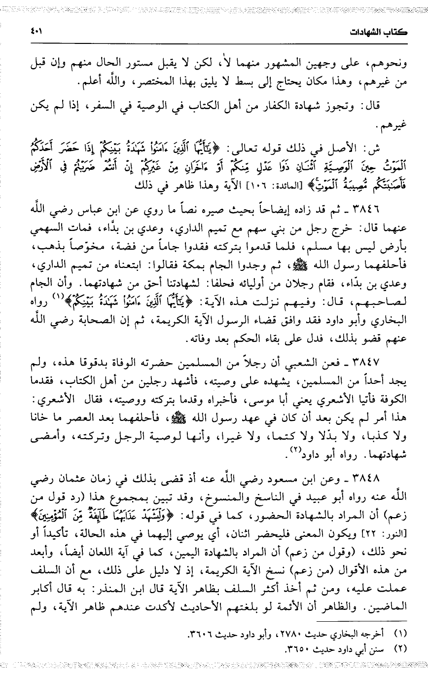 3847 فعن الشعبي أن رجلاً من المسلمين حضرته الوفاة بدقوقا هذه ، ولم يجد أحداً من المسلمين ، يشهده على وصيته ، فأشهد رجلين من أهل الكتاب ، فقدما الكوفة فأتيا الأشعري يعني أبا موسى ، فأخبراه وقدما بتركته ووصيته ، فقال الأشعري : هذا أمر لم يكن بعد أن كان في عهد رسول اللَّه ، فأحلفهما بعد العصر ما خانا ولا كذبا ، ولا بدّ لا ولا كتما ، ولا غيرا ، وأنها لوصية الرجل وتركته ، وأمضى شهادتهما . رواه أبو داود .