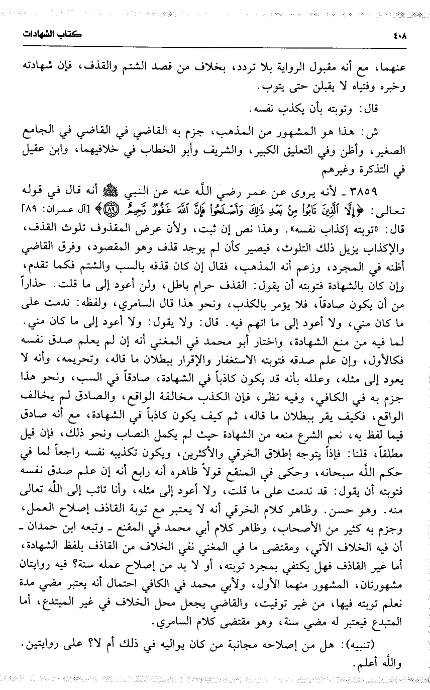 3859 لأنه يروى عن عمر رضي اللَّه عنه عن النبي أنه قال في قوله تعالى : [ ب 2 ] 19 ( { إلا الذين تابوا من بعد ذلك وأصلحوا فإن اللَّه غفور رحيم } ) [ ب 1 ] قال : ( توبته إكذاب نفسه ) . وهذا نص إن ثبت ، ولأن عرض المقذوف تلوث القذف ، والإكذاب يزيل ذلك التلوث ، فيصير كأن لم يوجد قذف وهو المقصود ، وفرق القاضي أظنه في المجرد ، وزعم أنه المذهب ، فقال إن كان قذفه بالسب والشتم فكما تقدم ، وإن كان بالشهادة فتوبته أن يقول : القذف حرام باطل ، ولن أعود إلى ما قلت . حذاراً من أن يكون صادقاً ، فلا يؤمر بالكذب ، ونحو هذا قال السامري ، ولفظه : ندمت على ما كان مني ، ولا أعود إلى ما اتهم فيه . قال : ولا يقول : ولا أعود إلى ما كان مني . لما فيه من منع الشهادة ، واختار أبو محمد في المغني أنه إن لم يعلم صدق نفسه فكالأول ، وإن علم صدقه فتوبته الاستغفار والإقرار ببطلان ما قاله ، وتحريمه ، وأنه لا يعود إلى مثله ، وعلله بأنه قد يكون كاذباً في الشهادة ، صادقاً في السب ، ونحو هذا جزم به في الكافي ، وفيه نظر ، فإن الكذب مخالفة الواقع ، والصادق لم يخالف الواقع ، فكيف يقر ببطلان ما قاله ، ثم كيف يكون كاذباً في الشهادة ، مع أنه صادق فيما لفظ به ، نعم الشرع منعه من الشهادة حيث لم يكمل النصاب ونحو ذلك ، فإن قيل مطلقاً ، قلنا : فإذاً يتوجه إطلاق الخرقي والأكثرين ، ويكون تكذيبه نفسه راجعاً لما في حكم اللَّه سبحانه ، وحكى في المنقع قولاً ظاهره أنه رابع أنه إن علم صدق نفسه فتوبته أن يقول : قد ندمت على ما قلت ، ولا أعود إلى مثله ، وأنا تائب إلى اللَّه تعالى منه . وهو حسن . وظاهر كلام الخرقي أنه لا يعتبر مع توبة القاذف إصلاح العمل ، وجزم به كثير من الأصحاب ، وظاهر كلام أبي محمد في المقنع وتبه ابن حمدان أن فيه الخلاف الآتي ، ومقتضى ما في المغني نفي الخلاف من القاذف بلفظ الشهادة ، أما غير القاذف فهل يكتفي بمجرد توبته ، أو لا بد من إصلاح عمله سنة ؟ فيه روايتان مشهورتان ، المشهور منهما الأول ، ولأبي محمد في الكافي احتمال أنه يعتبر مضي مدة نعلم توبته فيها ، من غير توقيت ، واقاضي يجعل محل الخلاف في غير المبتدع ، أما المتبدع فيعتبر له مضي سنة ، وهو مقتضى كلام السامري .