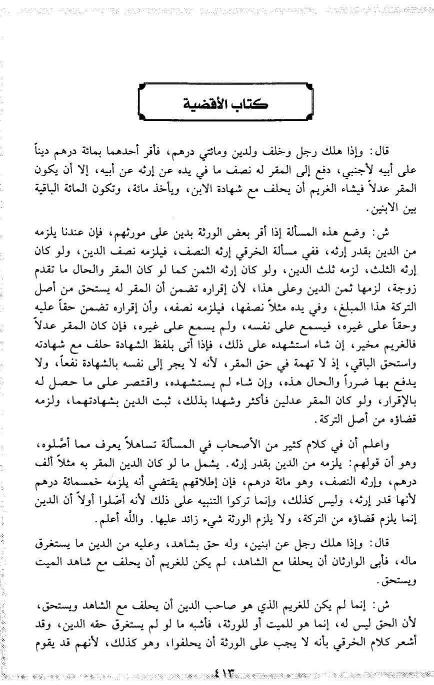 ش : وضع هذه المسألة إذا أقر بعض الورثة بدين على مورثهم ، فإن عندنا يلزمه من الدين بقدر إرثه ، ففي مسألة الخرقي إرثه النصف ، فيلزمه نصف الدين ، ولو كان إرثه الثلث ، لزمه ثلث الدين ، ولو كان إرثه الثمن كما لو كان المقر والحال ما تقدم زوجة ، لزمها ثمن الدين وعلى هذا ، لأن إقراره تضمن أن المقر له يستحق من أصل التركة هذا المبلغ ، وفي يده مثلاً نصفها ، فيلزمه نصفه ، وأن إقراره تضمن حقاً عليه وحقاً على غيره ، فيسمع على نفسه ، ولم يسمع على غيره ، فإن كان المقر عدلاً فالغريم مخير ، إن شاء اسشهده على ذلك ، فإذا أتى بلفظ الشهادة حلف مع شهادته واستحق الباقي ، إذ لا تهمة في حق المقر ، لأنه لا يجر إلى نفسه بالشهادة نفعاً ، ولا يدفع بها ضرراً والحال هذه ، وإن شاء لم يستشهده ، واقتصر على ما حصل له بالإقرار ، ولو كان المقر عدلين فأكثر وشهدا بذلك ، ثبت الدين بشهادتهما ، ولزمه قضاؤه من أصل التركة .