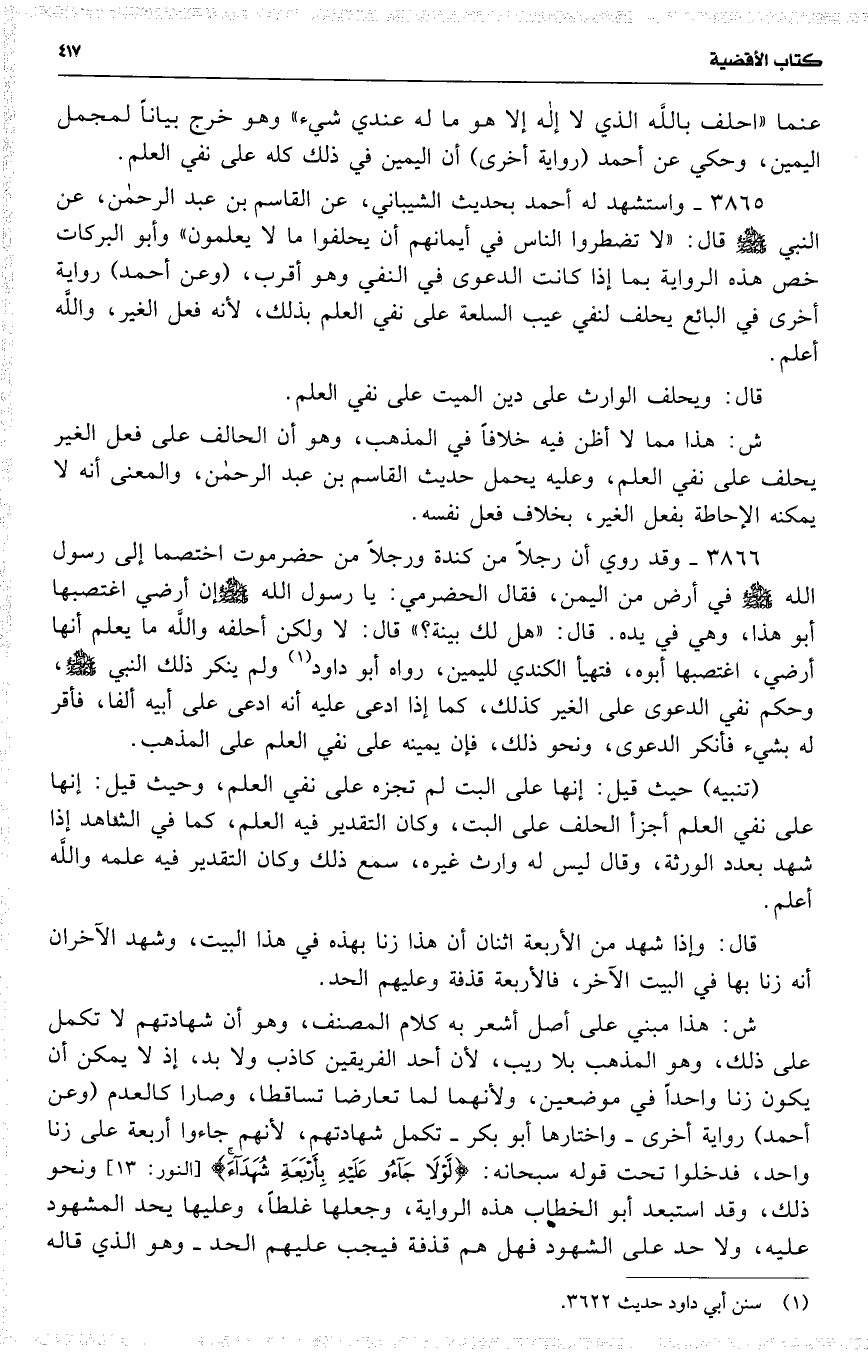 3866 وقد روي أن رجلاً من كندة ورجلاً من حضرموت اختصما إلى رسول اللَّه في أرض من اليمن ، فقال الحضرمي : يا رسول اللَّه إن أرضي اغتصبها أبو هذا ، وهي في يده . قال : ( هل لك بينة ؟ ) قال : لا ولكن أحلفه واللَّه ما يعلم أنها أرضي ، اغتصبها أبوه ، فتهيأ الكندي لليمين ، رواه أبو داود ولم ينكر ذلك النبي ، وحكم نفي الدعوى على الغير كذلك ، كما إذا ادعى عليه أنه ادعى علي أبيه ألفا ، فأقر له بشيء فأنكر الدعوى ، ونحو ذلك ، فإن يمينه على نفي العلم على المذهب .