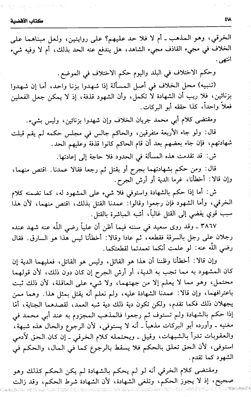 3867 وقد روى سعيد في سننه فيما أظن أن علياً رضي اللَّه عنه شهد عنده رجلان على رجل بالسرقة فقطعه ، ثم عادا وقالا : أخطأنا ليس هذا هو السارق . فقال رضي اللَّه عنه : لو علمت أنكما تعمدتما لقطعتكما .