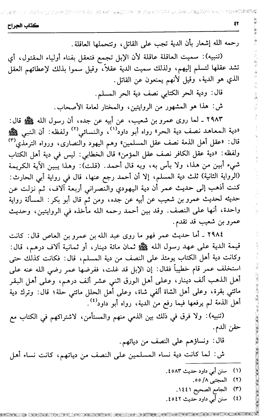 2984 أما حديث عمر فهو ما روى عبد الله بن عمرو بن العاص قال : 16 ( كانت قيمة الدية على عهد رسول الله ثمان مائة دينار ، أو ثمانية آلاف درهم ، قال : وكانت دية أهل الكتاب يومئذ على النصف من دية المسلم ، قال : فكانت كذلك حتى استخلف عمر قام خطيباً فقال : إن الإبل قد غلت ، ففرضها عمر رضي الله عنه على أهل الذهب ألف دينار ، وعلى أهل الورق اثني عشر ألف درهم ، وعلى أهل البقر مائتي بقرة ، وعلى أهل الشاة ألفي شاة ، وعلى أهل الحلل مائتي حلة ؛ قال : وترك دية أهل الذمة لم يرفعها فيما رفع من الدية ) ، رواه أبو داود .