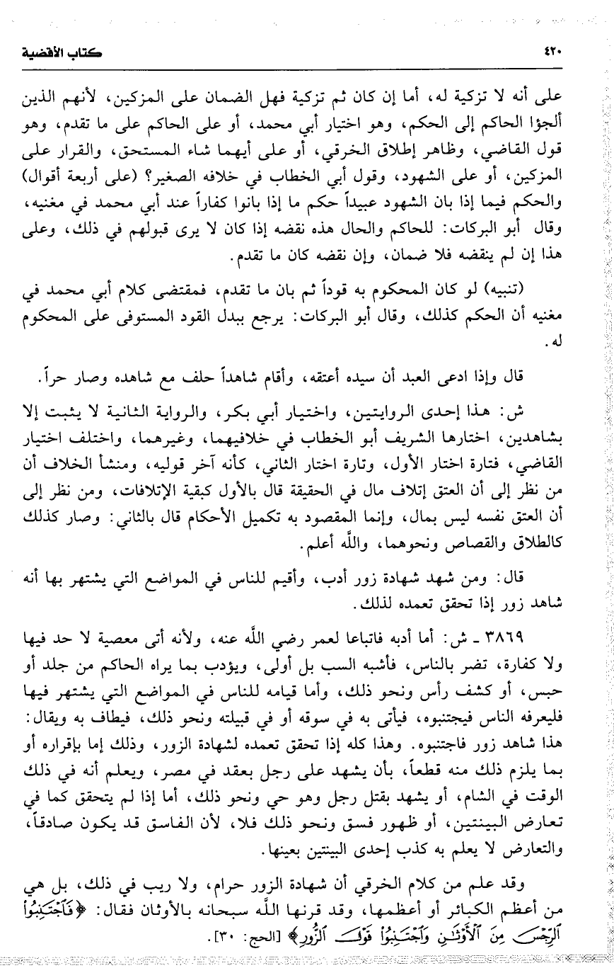 وقد علم من كلام الخرقي أن شهادة الزور حرام ، ولا ريب في ذلك ، بل هي من أعظم الكبائر أو أعظمها ، وقد قرنها اللَّه في ذلك ، بل هي من أعظم الكبائر أو أعظمها ، وقد قرنها اللَّه سبحانه بالأوثان فقال : [ ب 2 ] 19 ( { فاجتنبوا الرجس من الأوثان ، واجتنبوا قول الزور } ) [ ب 1 ] .