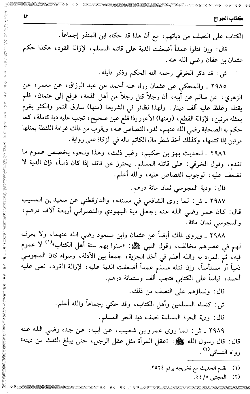 2988 ويروى ذلك أيضاً عن عثمان وابن مسعود رضي الله عنهما ، ولا يعرف لهم في عصرهم مخالف ، وقول النبي : ( سنوا بهم سنة أهل الكتاب ) لا عموم فيه ، ثم المراد به والله أعلم في أخذ الجزية ، جمعاً بين الأدلة ، وسواء كان المجوسي ذمياً أو مستأمناً ، وإن قتله مسلم عمداً أضعفت الدية عليه ، لإزالة القود ، نص عليه أحمد ، قياساً على الكتابي فتجب ألف وستمائة درهم .