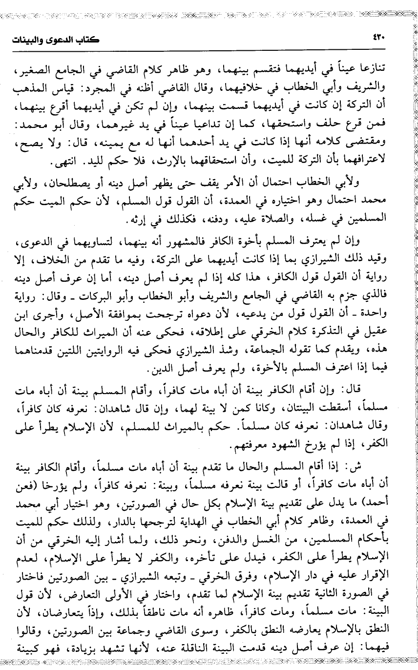 ش : إذا أقام المسلم والحال ما تقدم بينة أن أباه مات مسلماً ، وأقام الكافر بينة أن أباه مات كافراً ، أو قالت بينة نعرفه مسلماً ، وبينةً : نعرفه كافراً ، ولم يؤرخا ( فعن أحمد ) ما يدل على تقديم بينة الإسلام بكل حال في الصورتين ، وهو اختيار أبي محمد في العمدة ، وظاهر كلام أبي الخطاب في الهداية لترجحها بالدار ، ولذلك حكم للميت بأحكام المسلمين ، من الغسل والدفن ، ونحو ذلك ، ولما أشار إليه الخرقي من أن الإسلام يطرأ على الكفر ، فيدل على تأخره ، والكفر لا يطرأ على الإسلام ، لعدم الإقرا عليه في دار الإسلام ، وفرق الخرقي وتبعه الشيرازي بين الصورتين فاختار في الصورة الثانية تقديم بينة الإسلام لما تقدم ، واختار في الأولى التعارض ، لأن قول البينة : مات مسلماً ، ومات كافراً ، ظاهره أنه مات ناطقاً بذلك ، وإذاً يتعارضان ، لأن النطق بالإسلام يعارضه النطق بالكفر ، وسوى القاضي وجماعة بين الصورتين ، وقالوا فيهما : إن عرف أصل دينه قدمت البينة الناقلة عنه ، لأنها تشهد بزيادة ، فهو كبينة