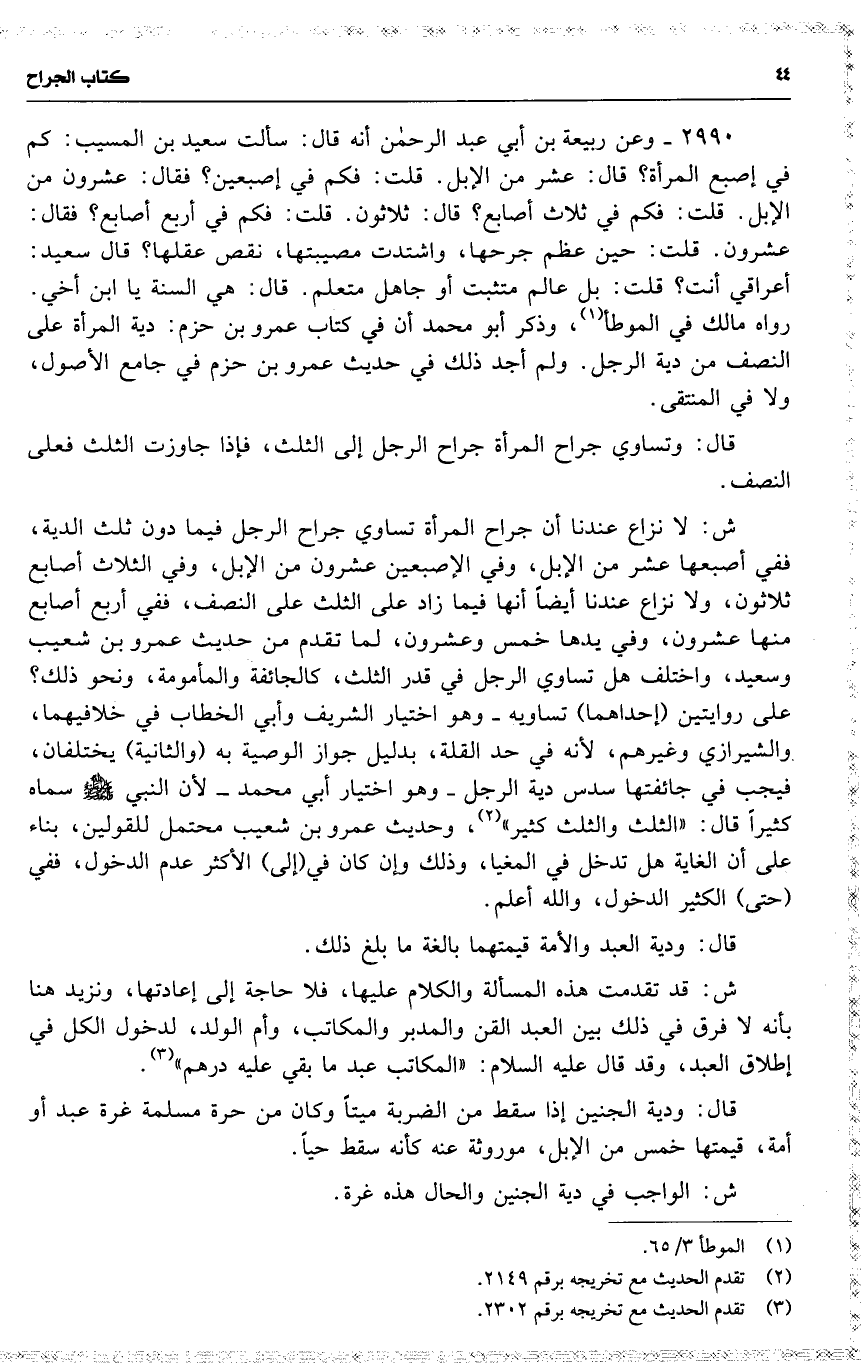 2990 وعن ربيعة بن أبي عبد الرحمن أنه قال : 16 ( سألت سعيد بن المسيب : كم في إصبع المرأة ؟ قال : عشر من الإبل . قلت : فكم في إصبعين ؟ فقال : عشرون من الإبل . قلت : فكم في ثلاث أصابع ؟ قال : ثلاثون . قلت : فكم في أربع أصابع ؟ فقال : عشرون . قلت : حين عظم جرحها ، واشتدت مصيبتها ، نقص عقلها ؟ قال سعيد : أعراقي أنت ؟ قلت : بل عالم متثبت أو جاهل متعلم . قال : هي السنة يا ابن أخي ) . رواه مالك في الموطأ ، وذكر أبو محمد أن في كتاب عمرو بن حزم : دية المرأة على النصف من دية الرجل . ولم أجد ذلك في حديث عمرو بن حزم في جامع الأصول ، ولا في المنتقى .
