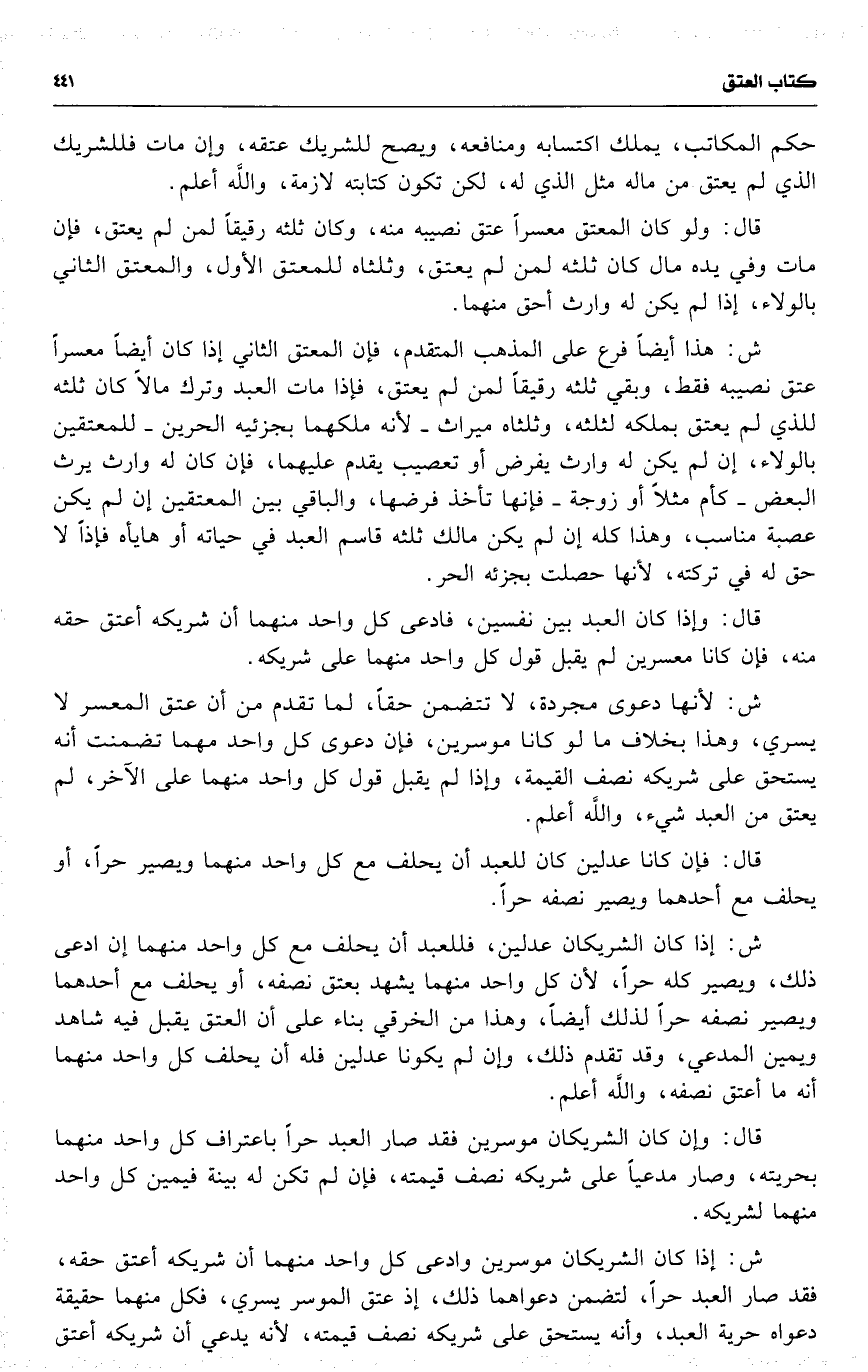 ش : إذا كان الشريكان موسرين وادعى كل واحد منهما أن شريكه أعتق حقه ، فقد صار العبد حراً ، لتضمن دعواهما ذلك ، إذ عتق الموسر يسري ، فكل منهما حقيقة دعواه حرية العبد ، وأنه يستحق على شريكه نصف قيمته ، لأنه يدعي أن شريكه أعتق