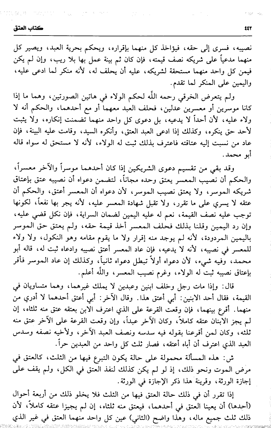 وقد بقي من تقسيم دعوى الشريكين إذا كان أحدهما موسراً والآخر معسراً ، والحكم أن نصيب المعسر يعتق وحده مجاناً ، لتضمن دعواه أن نصيبه عتق بإعتاق شريكه الموسر ، ولا يعتق نصيب الموسر ، لأن دعواه أن المعسر أعتق ، والحكم أن عتقه لا يسري على ما تقرر ، ولا تقبل شهادة المعسر عليه ، لأنه يجر بها نفعاً ، لكونها توجب عليه نصف القيمة ، نعم له علي اليمين لضمان السراية ، فإن نكل قضي عليه ، وإن رد اليمين وقلنا بذلك فحلف المعسر أخذ قيمة حقه ، ولم يعتق حق الموسر باليمين المردودة ، لأنه لم يوجد منه إقرار ولا ما يقوم مقامه وهو النكول ، ولا ولاء للمعسر في نصيبه ، لأنه لا يدعيه ، فإن عاد المعسر أعتق نصيبه وادعاه ثبت له ، قاله أبو محمد ، وفيه شيء ، لأن دعواه أولاً تبطل دعواه ثانياً ، وكذلك إن عاد الموسر فأقر بإعتاق نصيبه ثبت له الولاء ، وغرم نصيب المعسر ، واللَّه أعلم .