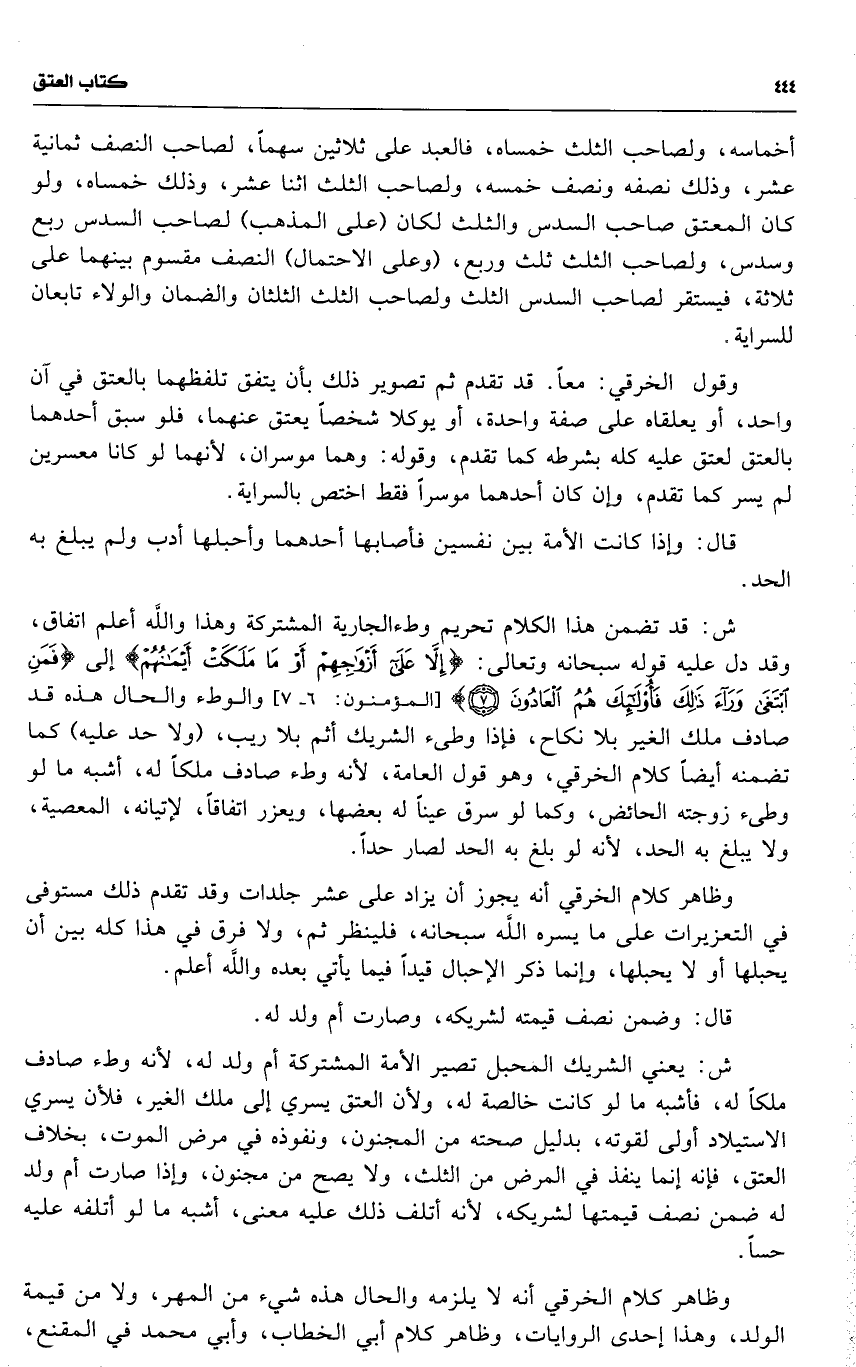 ش : قد تضمن هذا الكلام تحريم وطءالجارية المشتركة وهذا واللَّه أعلم اتفاق ، وقد دل عليه قوله سبحانه وتعالى : [ ب 2 ] 19 ( { إلا على أزواجهم أو ما ملكت أيمانهم } ) [ ب 1 ] إلى [ ب 2 ] 19 ( { فمن ابتغى وراء ذلك فأولئك هم العادون } ) [ ب 1 ] والوطء والحال هذه قد صادف ملك الغير بلا نكاح ، فإذا وطىء الشريك أثم بلا ريب ، ( ولا حد عليه ) كما تضمنه أيضاً كلام الخرقي ، وهو قول العامة ، لأنه وطء صادف ملكاً له ، أشبه ما لو وطىء زوجته الحائض ، وكما لو سرق عيناً له بعضها ، ويعزر اتفاقاً ، لإتيانه ، المعصية ، ولا يبلغ به الحد ، لأنه لو بلغ به الحد لصار حداً .