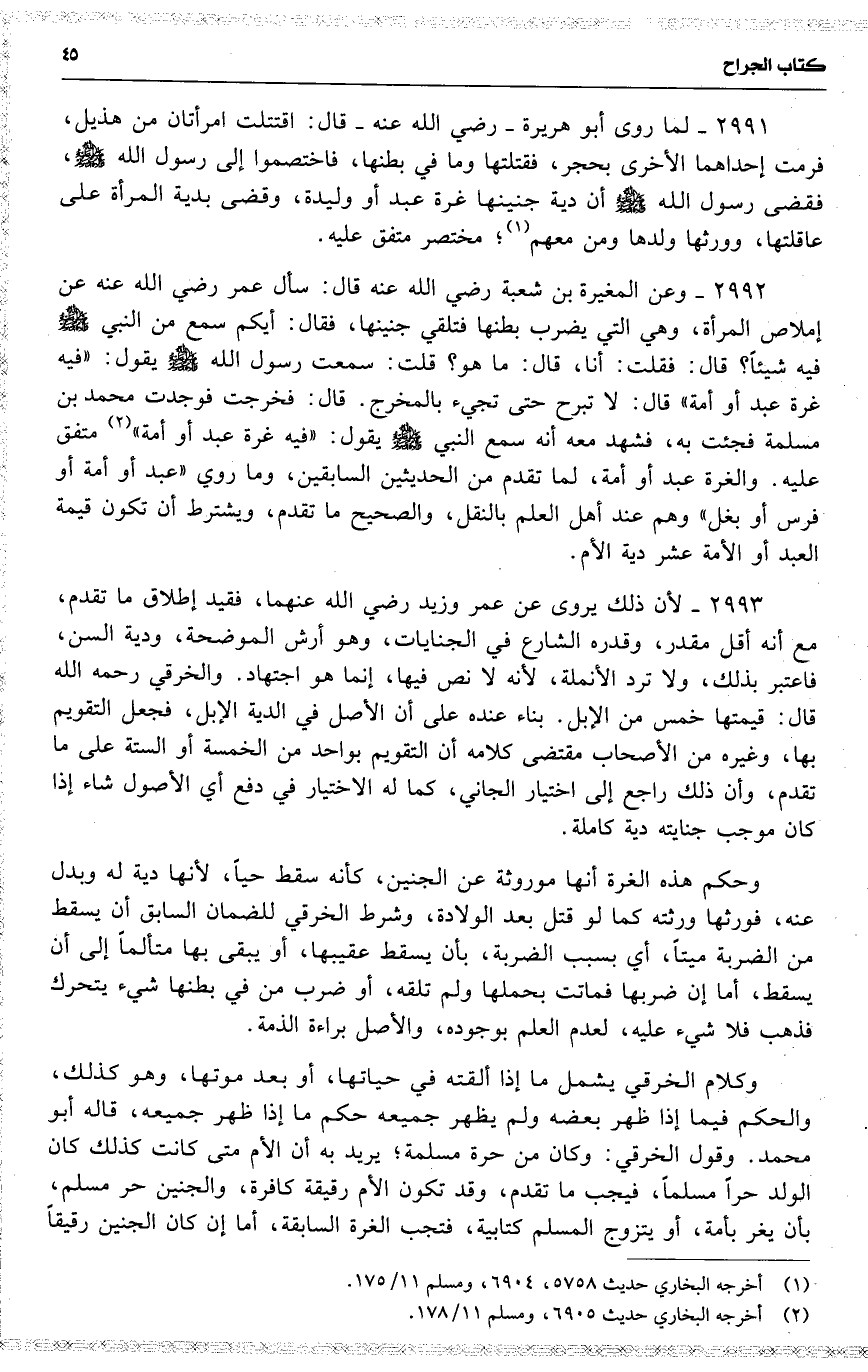 2992 وعن المغيرة بن شعبة رضي الله عنه قال : سأل عمر رضي الله عنه عن إملاص المرأة ، وهي التي يضرب بطنها فتلقي جنينها ، فقال : أيكم سمع من النبي فيه شيئاً ؟ قال : فقلت : أنا ، قال : ما هو ؟ قلت : سمعت رسول الله يقول : ( فيه غرة عبد أو أمة ) قال : لا تبرح حتى تجيبء بالمخرج . قال : فخرجت فوجدت محمد بن مسلمة فجئت به ، فشهد معه أنه سمع النبي يقول : ( فيه غرة عبد أو أمة ) متفق عليه . والغرة عبد أو أمة ، لما تقدم من الحديثين السابقين ، وما روي ( عبد أو أمة أو فرس أو بغل ) وهم عند أهل العلم بالنقل ، والصحيح ما تقدم ، ويشترط أن تكون قيمة العبد أو الأمة عشر دية الأم .