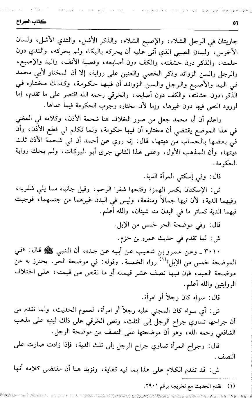 ش : أي سواء كان المجني عليه رجلاً أو امرأة ، لعموم الحديث ، ولما تقدم من أن جراحها تساوي جراح الرجل إلى الثلث ، ونص الخرقي على ذلك لينبه على مذهب الشافعي رحمه الله ، وهو أن موضحتها على النصف من موضحة الرجل .