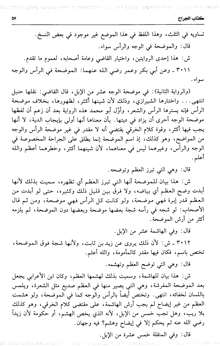 ( والرواية الثانية ) : في موضحة الوجه عشر من الإبل ، قال القاضي : نقلها حنبل انتهى . . . واختارها الشيرازي ، وذلك لأن شينها أكثر ، لظهورها ، بخلاف موضحة الرأس فإنه يسترها الرأس والشعر ، وأوَّل أبو محمد هذه الرواية بعد أن زعم أن لفظها موضحة الوجه أحرى أن يزاد في ديتها . بأن معناها أنها أولى بإيجاب الدية ، لا أنها يجب فيها أكثر ، وقوة كلام الخرقي يقتضي أنه لا مقدر في غير موضحة الرأس والوجه من المواضح ، وهو كذلك ، إذ اسم الموضحة إنما يطلق على الجراحة المخصوصة في الوجه والرأس ، وغيرهما ليس في معناهما ، لأن شينهما أكثر ، وخطرهما أعظم والله أعلم .