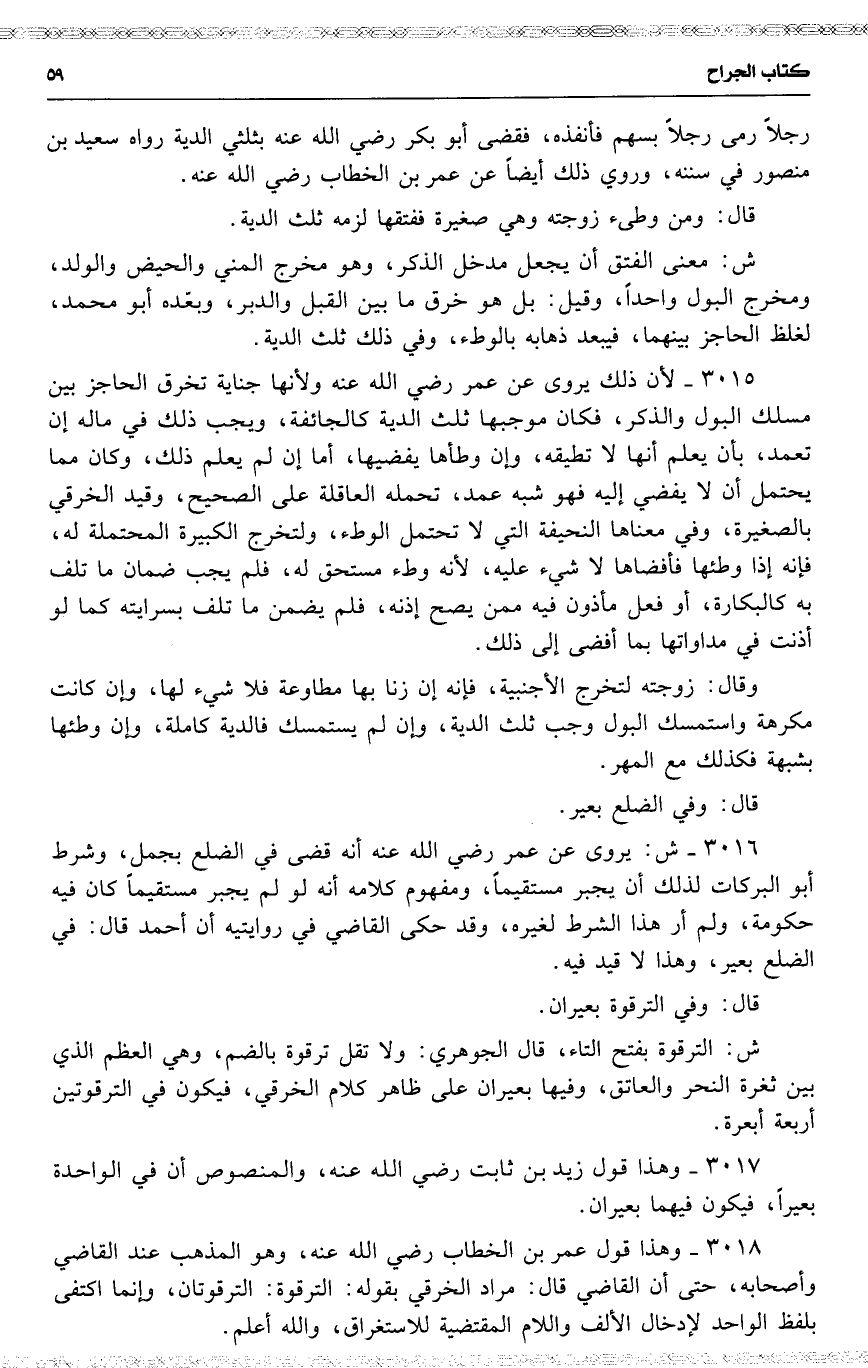 3016 ش : يروى عن عمر رضي الله عنه أنه قضى في الضلع بجمل ، وشرط أبو البركات لذلك أن يجبر مستقيماً ، ومفهوم كلامه أنه لو لم يجبر مستقيماً كان فيه حكومة ، ولم أر هذا الشرط لغيره ، وقد حكى القاضي في روايتيه أن أحمد قال : في الضلع بعير ، وهذا لا قيد فيه .