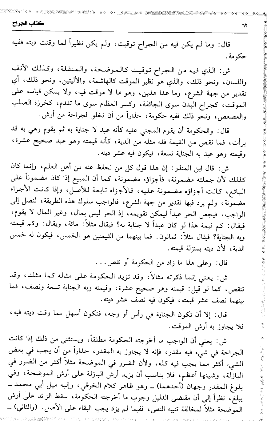 ش : الذي فيه من الجراح توقيت كالموضحة ، والمنقلة ، وكذلك الأنف واللسان ، ونحو ذلك ، والذي هو نظير الموقت كالهاشمة ، والأليتين ، ونحو ذلك ، أي تقدير من جهة الشرع ، وما عدا هذين ، وهو ما لا موقت فيه ، ولا يمكن قياسه على الموقت ، كجراح البدن سوى الجائفة ، وكسر العظام سوى ما تقدم ، كخرزة الصلب والعصعص ، ونحو ذلك ففيه حكومة ، حذاراً من أن تخلو الجراحة من أرش .