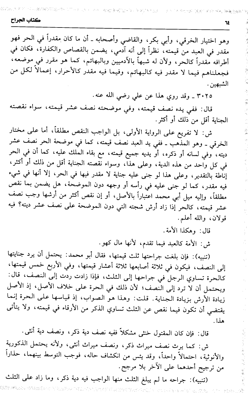 ش : لا تفريع على الرواية الأولى ، بل الواجب النقص مطلقاً ، أما على مختار الخرقي وهو المذهب ففي يد العبد نصف قيمته ، كما في موضحة الحر نصف عشر ديته ، وفي لسانه أو ذكره ، أو يديه جميع قيمته ، مع بقاء الملك عليه ، كما أن في الحر في كل واحد من هذه الدية ، وعلى هذا ، وسواء نقصته الجناية أقل من ذلك أو أكثر ، إناطة بالتقدير ، وعلى هذا لو جنى عليه جناية لا مقدر فيها في الحر ، إلا أنها في شيء فيه مقدر ، كما لو جنى عليه في رأسه أو وجهه دون الموضحة ، هل يضمن بما نقص مطلقاً ، وإليه ميل أبي محمد اعتباراً بالأصل ، أو إن نقص أكثر من أرشها وجب نصف عشر قيمته ، كالحر إذا زاد أرش شجته التي دون الموضحة على نصف عشر ديته ؟ فيه قولان ، والله أعلم .