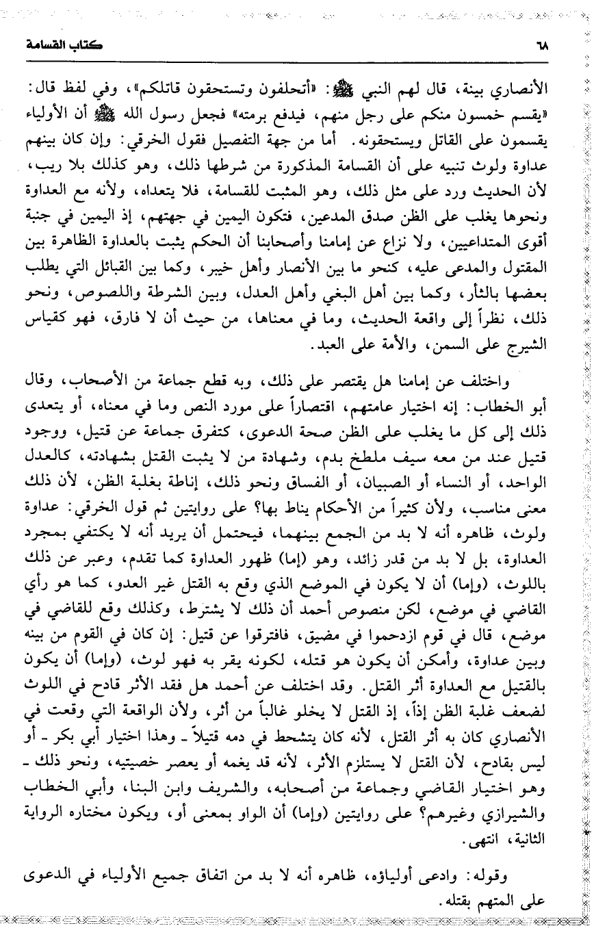 واختلف عن إمامنا هل يقتصر على ذلك ، وبه قطع جماعة من الأصحاب ، وقال أبو الخطاب : إنه اختيار عامتهم ، اقتصاراً على مورد النص وما في معناه ، أو يتعدى ذلك إلى كل ما يغلب على الظن صحة الدعوى ، كتفرق جماعة عن قتيل ، ووجود قتيل عند من معه سيف ملطخ بدم ، وشهادة من لا يثبت القتل بشهادته ، كالعدل الواحد ، أو النساء أو الصبيان ، أو الفساق ونحو ذلك ، إناطة بغلبة الظن ، لأن ذلك معنى مناسب ، ولأن كثيراً من الأحكام يناط بها ؟ على روايتين ثم قول الخرقي : عداوة ولوث ، ظاهره أنه لا بد من الجمع بينهما ، فيحتمل أن يريد أنه لا يكتفي بمجرد العداوة ، بل لا بد من قدر زائد ، وهو ( إما ) ظهور العداوة كما تقدم ، وعبر عن ذلك باللوث ، ( وإما ) أن لا يكون في الموضع الذي وقع به القتل غير العدو ، كما هو رأي القاضي في موضع ، لكن منصوص أحمد أن ذلك لا يشترط ، وكذلك وقع للقاضي في موضع ، قال في قوم ازدحموا في مضيق ، فافترقوا عن قتيل : إن كان في القوم من بينه وبين عداوة ، وأمكن أن يكون هو قتله ، لكونه يقر به فهو لوث ، ( وإما ) أن يكون بالقتيل مع العداوة أثر القتل . وقد اختلف عن أحمد هل فقد الأثر قادح في اللوث لضعف غلبة الظن إذاً ، إذ القتل لا يخلو غالباً من أثر ، ولأن الواقعة التي وقعت في الأنصاري كان به أثر القتل ، لأنه كان يتشحط في دمه قتيلاً وهذا اختيار أبي بكر أو ليس بقادح ، لأن القتل لا يستلزم الأثر ، لأنه قد يغمه أو يعصر خصيتيه ، ونحو ذلك وهو اختيار القاضي وجماعة من أصحابه ، والشريف وابن البنا ، وأبي الخطاب والشيرازي وغيرهم ؟ على روايتين ( وإما ) أن الواو بمعنى أو ، ويكون مختاره الرواية الثانية ، انتهى .