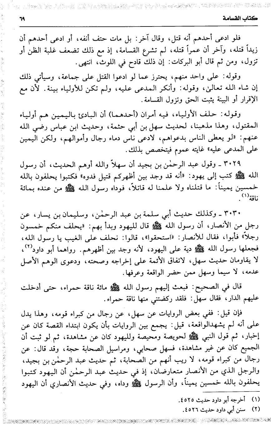 3030 وكذلك حديث أبي سلمة بن عبد الرحمن ، وسليمان بن يسار ، عن رجل من الأنصار ، أن رسول الله قال لليهود وبدأ بهم : ( يحلف منكم خمسون رجلاً ) فأبوا ، فقال للأنصار : ( استحقوا ) ، قالوا : نحلف على الغيب يا رسول الله ، فجعلها رسول الله دية على اليهود ، لأنه وجد بين أظهرهم . رواهما أبو داود ، لا يقاومان حديث سهل ، لاتفاق الأئمة على إخراجه وصحته ، ودعوى الوهم الأصل عدمه ، لا سيما وسهل ممن حضر الواقعة وعرفها .