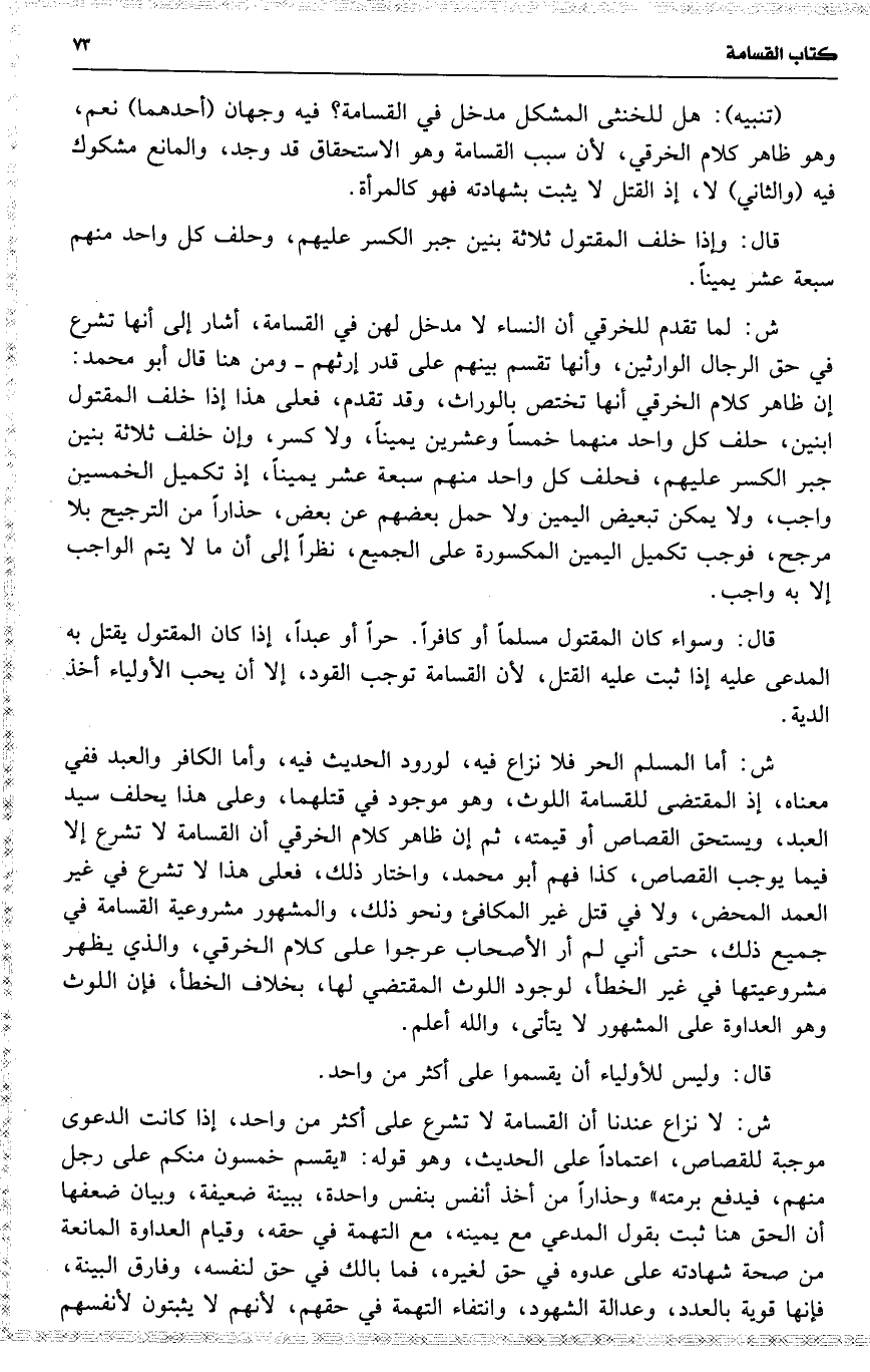ش : أما المسلم الحر فلا نزاع فيه ، لورود الحديث فيه ، وأما الكافر والعبد ففي معناه ، إذ المقتضى للقسامة اللوث ، وهو موجود في قتلهما ، وعلى هذا يحلف سيد العبد ، ويستحق القصاص أو قيمته ، ثم إن ظاهر كلام الخرقي أن القسامة لا تشرع إلا فيما يوجب القصاص ، كذا فهم أبو محمد ، واختار ذلك ، فعلى هذا لا تشرع في غير العمد المحض ، ولا في قتل غير المكافئ ونحو ذلك ، والمشهور مشروعية القسامة في جميع ذلك ، حتى أني لم أر الأصحاب عرجوا على كلام الخرقي ، والذي يظهر مشروعيتها في غير الخطأ ، لوجود اللوث المقتضي لها ، بخلاف الخطأ ، فإن اللوث وهو العداوة على المشهور لا يتأتى ، والله أعلم .