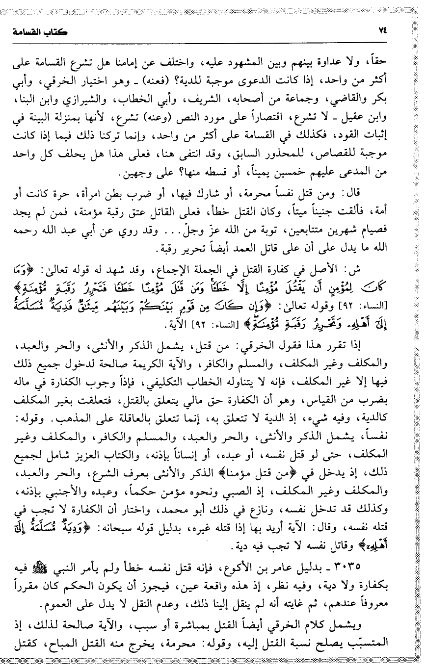 3035 بدليل عامر بن الأكوع ، فإنه قتل نفسه خطأ ولم يأمر النبي فيه بكفارة ولا دية ، وفيه نظر ، إذ هذه واقعة عين ، فيجوز أن يكون الحكم كان مقرراً معروفاً عندهم ، ثم غايته أنه لم ينقل إلينا ذلك ، وعدم النقل لا يدل على العموم .