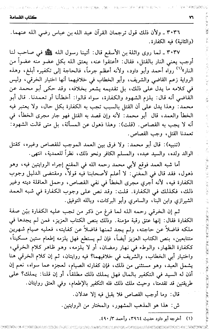 3037 لما روى واثلة بن الأسقع قال : أتينا رسول الله في صاحب لنا أوجب يعني النار بالقتل ، فقال : ( أعتقوا عنه ، يعتق الله بكل عضو منه عضواً من النار ) رواه أحمد وأبو داود ، ولأنه أعظم جرماً ، فالحاجة إلى تكفيره أبلغ ، وهذه الرواية زعم القاضي والشريف ، وأبو الخطاب في خلافيهما أنها اختيار الخرقي ، وليس في كلامه ما يدل على ذلك ، بل تقديمه يشعر بخلافه ، وقد حكى أبو محمد عن القاضي أنه قال : يلزم الشهود والكفارة ، سواء قالوا : أخطأنا أو تعمدنا . قال أبو محمد : وهذا يدل على أن القتل بالسبب تجب به الكفارة بكل حال ، ولا يعتبر فيه الخطأ والعمد ، قال أبو محمد : لأنه وإن قصد به القتل فهو جار مجرى الخطأ ، في أنه لا يجب به القصاص . ( قلت ) : وهذا ذهول عن المسألة ، بل متى قالت الشهود : تعمدنا القتل ، وجب القصاص .
