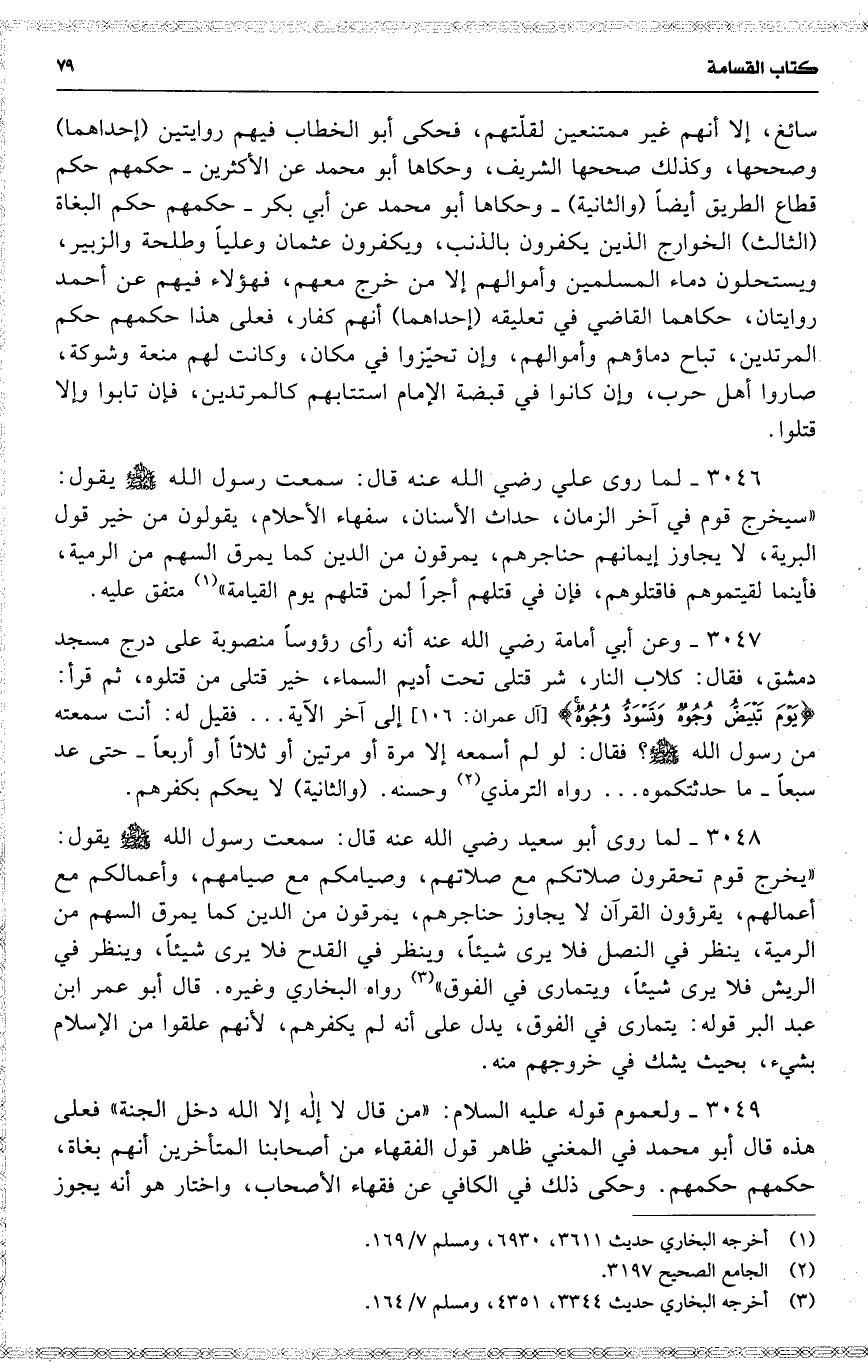 3048 لما روى أبو سعيد رضي الله عنه قال : سمعت رسول الله يقول : ( يخرج قوم تحقرون صلاتكم مع صلاتهم ، وصيامكم مع صيامهم ، وأعمالكم مع أعمالهم ، يقرؤون القرآن لا يجاوز حناجرهم ، يمرقون من الدين كما يمرق السهم من الرمية ، ينظر في النصل فلا يرى شيئاً ، وينظر في القدح فلا يرى شيئاً ، وينظر في الريش فلا يرى شيئاً ، ويتمارى في الفوق ) رواه البخاري وغيره . قال أبو عمر ابن عبد البر قوله : يتمارى في الفوق ، يدل على أنه لم يكفرهم ، لأنهم علقوا من الإسلام بشيء ، بحيث يشك في خروجهم منه .