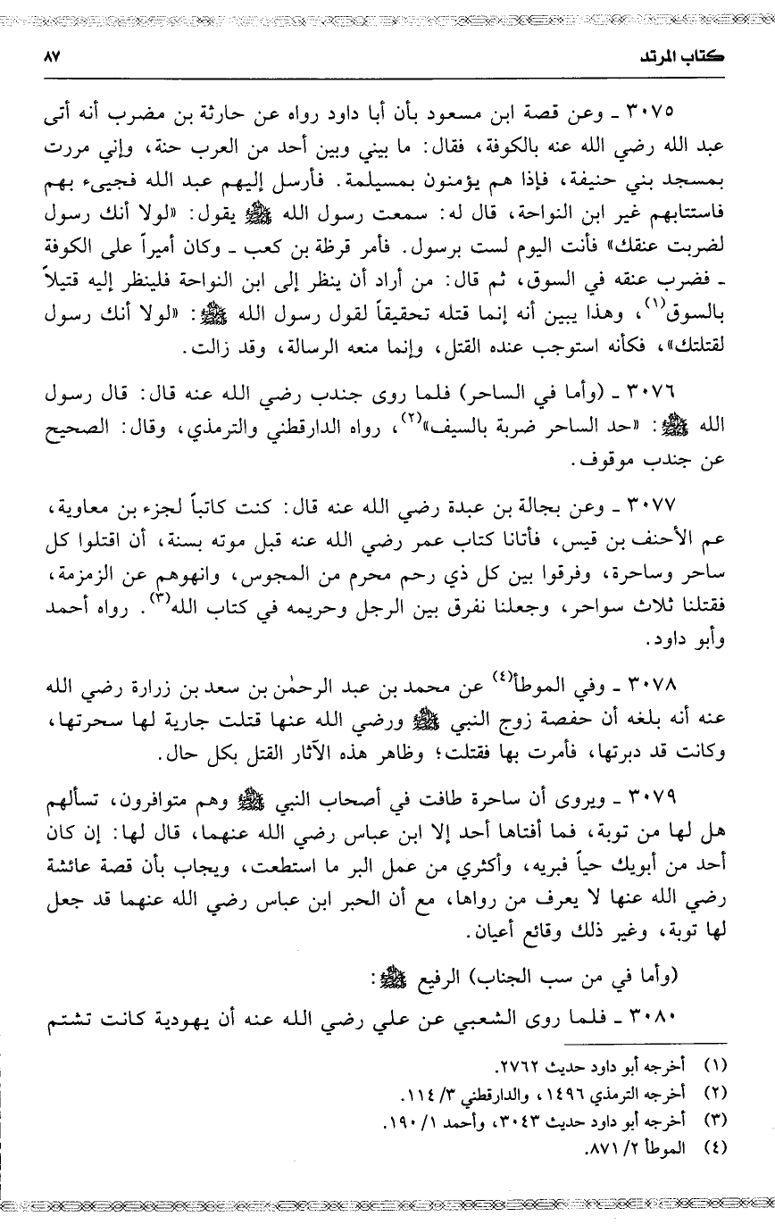 3078 وفي الموطأ عن محمد بن عبد الرحمن بن سعد بن زرارة رضي الله عنه 16 ( أنه بلغه أن حفصة زوج النبي ورضي الله عنها قتلت جارية لها سحرتها ، وكانت قد دبرتها ، فأمرت بها فقتلت ) ؛ وظاهر هذه الآثار القتل بكل حال .