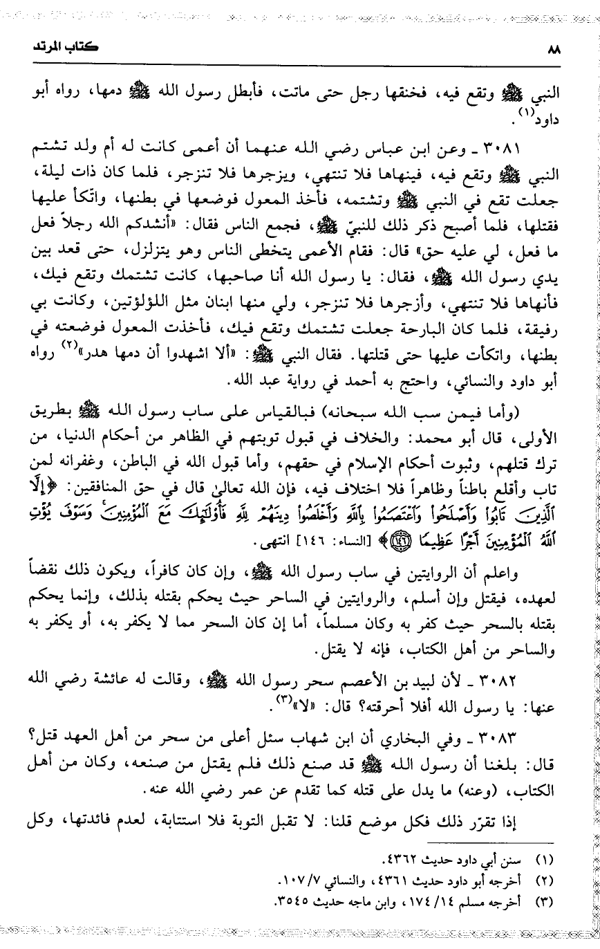 3081 وعن ابن عباس رضي الله عنهما أن أعمى كانت له أم ولد تشتم النبي وتقع فيه ، فينهاها فلا تنتهي ، ويزجرها فلا تنزجر ، فلما كان ذات ليلة ، جعلت تقع في النبي وتشتمه ، فأخذ المعول فوضعها في بطنها ، واتّكأ عليها فقتلها ، فلما أصبح ذكر ذلك للنبيّ ، فجمع الناس فقال : ( أنشدكم الله رجلاً فعل ما فعل ، لي عليه حق ) قال : فقام الأعجمي يتخطى الناس وهو يتزلزل ، حتى قعد بين يدي رسول الله ، فقال : يا رسول الله أنا صاحبها ، كانت تشتمك وتقع فيك ، فأنهاها فلا تنتهي ، وأزجرها فلا تنزجر ، ولي منها ابنان مثل اللؤلؤتين ، وكانت بي رفيقة ، فلما كان البارحة جعلت تشتمك وتقع فيك ، فأخذت المعول فوضعته في بطنها ، واتكأت عليها حتى تقتلها . فقال النبي : ( ألا اشهدوا أن دمها هدر ) رواه أبو داود والنسائي ، واحتج به أحمد في رواية عبد الله .