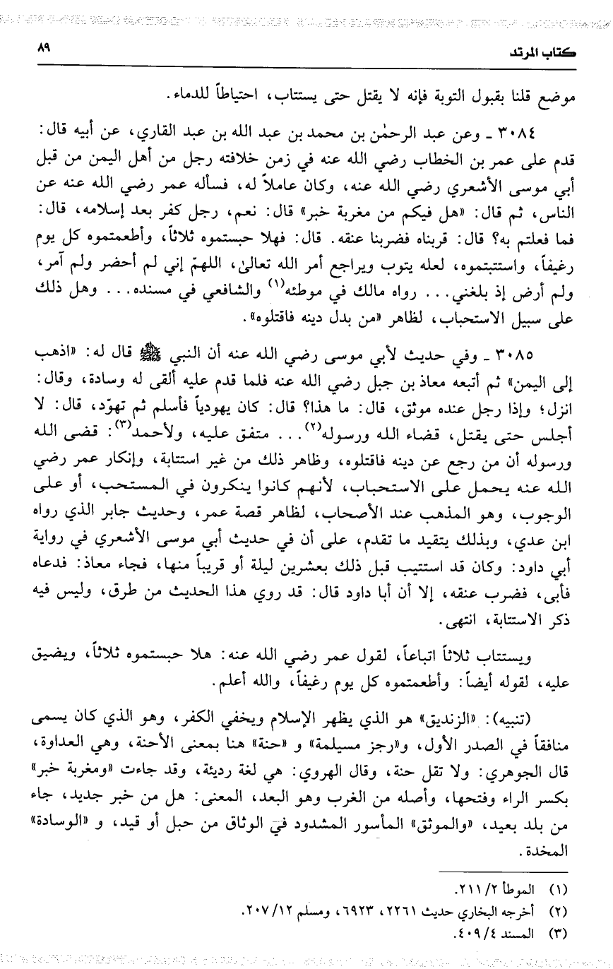 3085 وفي حديث لأبي موسى رضي الله عنه أن النبي قال له : ( اذهب إلى اليمن ) ثم أتبعه معاذ بن جبل رضي الله عنه فلما قدم عليه ألقى له وسادة ، وقال : انزل ؛ وإذا رجل عنده موثق ، قال : ما هذا ؟ قال : كان يهودياً فأسلم ثم تهوّد ، قال : لا أجلس حتى يقتل ، قضاء الله ورسوله . . . متفق عليه ، ولأحمد : قضى الله ورسوله أن من رجع عن دينه فاقتلوه ، وظاهر ذلك من غير استتابة ، وإنكار عمر رضي الله عنه يحمل على الاستحباب ، لأنهم كانوا ينكرون في المستحب ، أو على الوجوب ، وهو المذهب عند الأصحاب ، لظاهر قصة عمر ، وحديث جابر الذي رواه ابن عدي ، وبذلك يتقيد ما تقدم ، على أن في حديث أبي موسى الأشعري في رواية أبي داود : وكان قد استتيب قبل ذلك بعشرين ليلة أو قريباً منها ، فجاء معاذ : فدعاه فأبى ، فضرب عنقه ، إلا أن أبا داود قال : قد روي هذا الحديث من طرق ، وليس فيه ذكر الاستتابة ، انتهى .