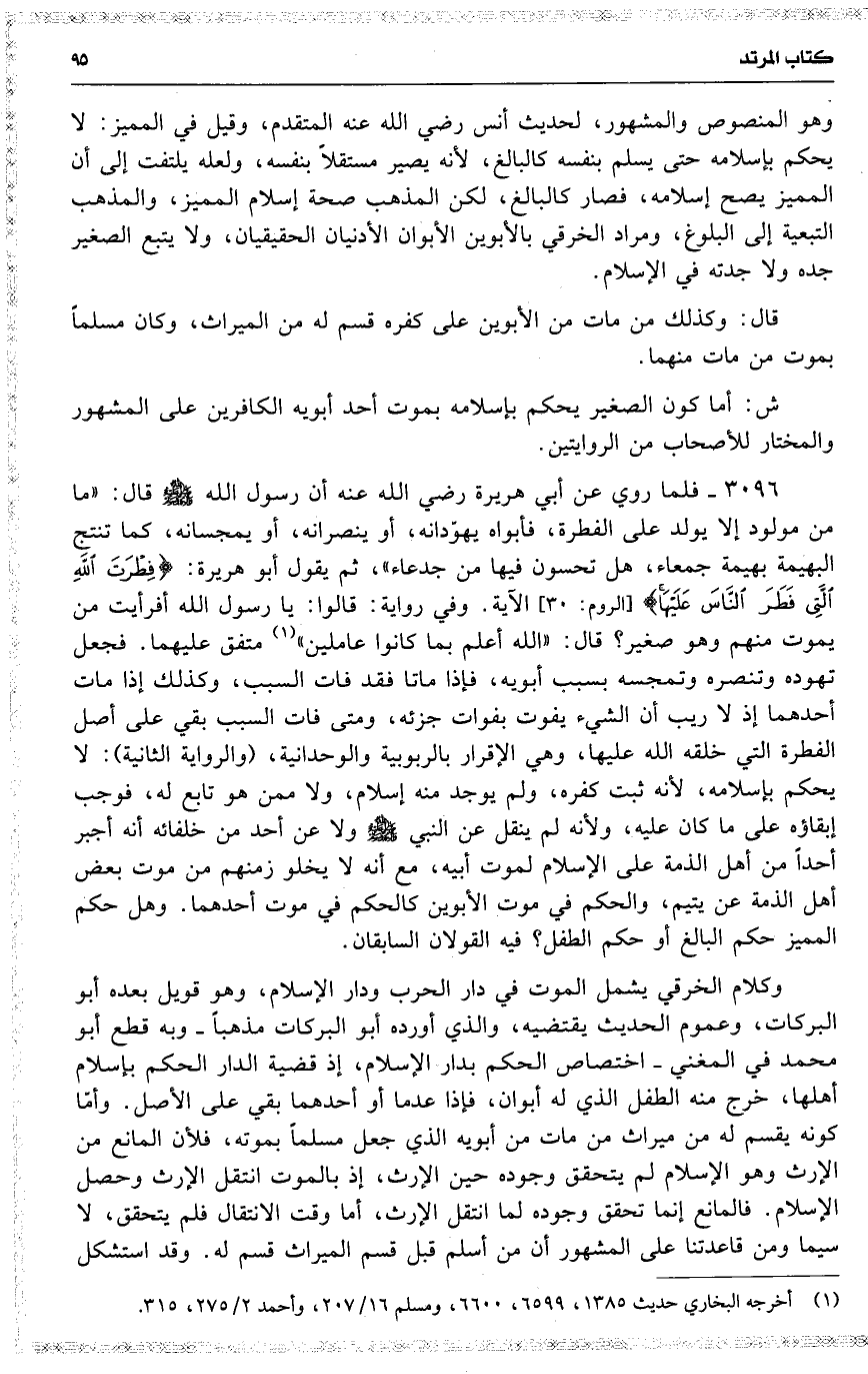3096 فلما روي عن أبي هريرة رضي الله عنه أن رسول الله قال : ( ما من مولود إلا يولد على الفطرة ، فأبواه يهوّدانه ، أو ينصرانه ، أو يمجسانه ، كما تنتج البهيمة بهيمة جمعاء ، هل تحسون فيها من جدعاء ) ، ثم يقول أبو هريرة : 19 ( { فطرة الله التي فطر الناس عليها } ) الآية . وفي رواية : قالوا : يا رسول الله أفرأيت من يموت منهم وهو صغير ؟ قال : ( الله أعلم بما كانوا عاملين ) متفق عليهما . فجعل تهوده وتنصره وتمجسه بسبب أبويه ، فإذا ماتا فقد فات السبب ، وكذلك إذا مات أحدهما إذ لا ريب أن الشيء يفوت بفوات جزئه ، ومتى فات السبب بقي على أصل الفطرة التي خلقه الله عليها ، وهي الإقرار بالربوبية والوحدانية ، ( والرواية الثانية ) : لا يحكم بإسلامه ، لأنه ثبت كفره ، ولم يوجد منه إسلام ، ولا ممن هو تابع له ، فوجب إبقاؤه على ما كان عليه ، ولأنه لم ينقل عن النبي ولا عن أحد من خلفائه أنه أجبر أحداً من أهل الذمة على الإسلام لموت أبيه ، مع أنه لا يخلو زمنهم من موت بعض أهل الذمة عن يتيم ، والحكم في موت الأبوين كالحكم في موت أحدهما . وهل حكم المميز حكم البالغ أو حكم الطفل ؟ فيه القولان السابقان .