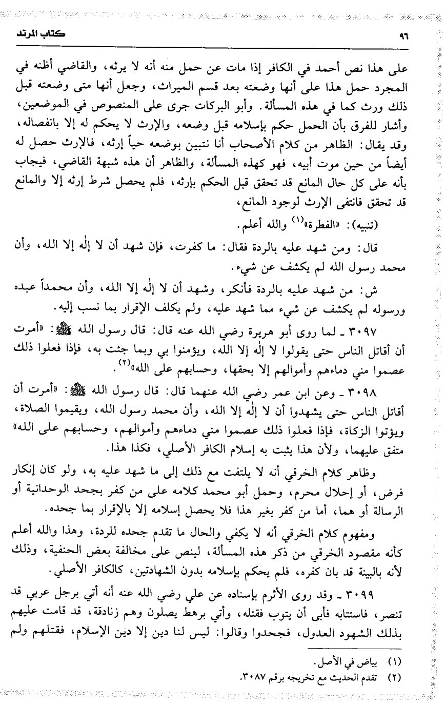 ش : من شهد عليه بالردة فأنكر ، وشهد أن لا إله إلا الله ، وأن محمداً عبده ورسوله لم يكشف عن شيء مما شهد عليه ، ولم يكلف الإقرار بما نسب إليه .