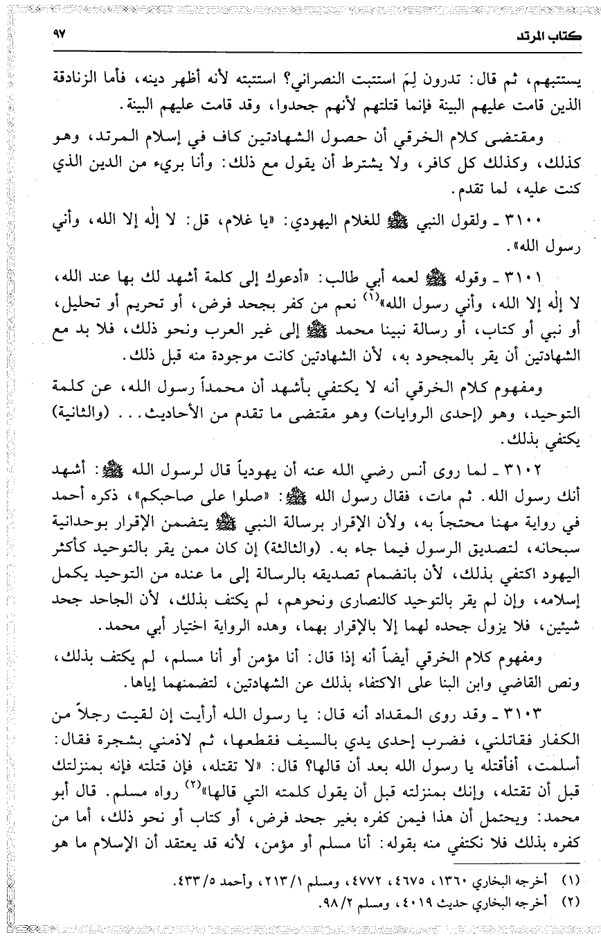 ومفهوم كلام الخرقي أنه لا يكتفي بأشهد أن محمداً رسول الله ، عن كلمة التوحيد ، وهو ( إحدى الروايات ) وهو مقتضى ما تقدم من الأحاديث . . . ( والثانية ) يكتفي بذلك .