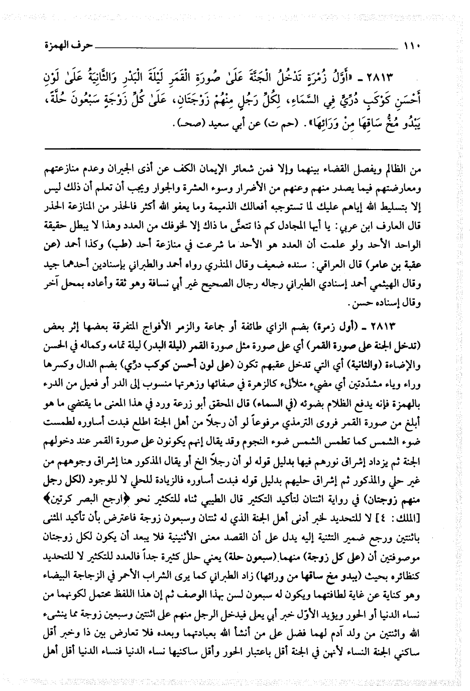 2813 (أول زمرة) بضم الزاي طائفة أو جماعة والزمر الأفواج المتفرقة بعضها إثر بعض (تدخل الجنة على صورة القمر) أي على صورة مثل صورة القمر (ليلة البدر) ليلة تمامه وكماله في الحسن والإضاءة (والثانية) أي التي تدخل عقبهم تكون (على لون أحسن كوكب دري) بضم الدال وكسرها وراء وياء مشددتين أي مضئ متلألئ كالزهرة في صفائها وزهرتها منسوب إلى الدر أو فعيل من الدرء بالهمزة فإنه يدفع الظلام بضوئه (في السماء) قال المحقق أبو زرعة : ورد في هذا المعنى ما يقتضي ما هو أبلغ من صورة القمر فروى الترمذي مرفوعا لو أن رجلا من أهل الجنة اطلع فبدت أساوره لطمست ضوء الشمس كما تطمس الشمس ضوء النجوم وقد يقال إنهم يكونون على صورة القمر عند دخولهم الجنة ثم يزداد إشراق نورهم فيها بدليل قوله لو أن رجلا إلخ أو يقال المذكور هنا إشراق وجوههم من غير حلي والمذكور ثم إشراق حليهم بدليل قوله فبدت أساوره فالزيادة للحلي لا للوجود (لكل رجل منهم زوجتان) في رواية اثنتان لتأكيد التكثير.