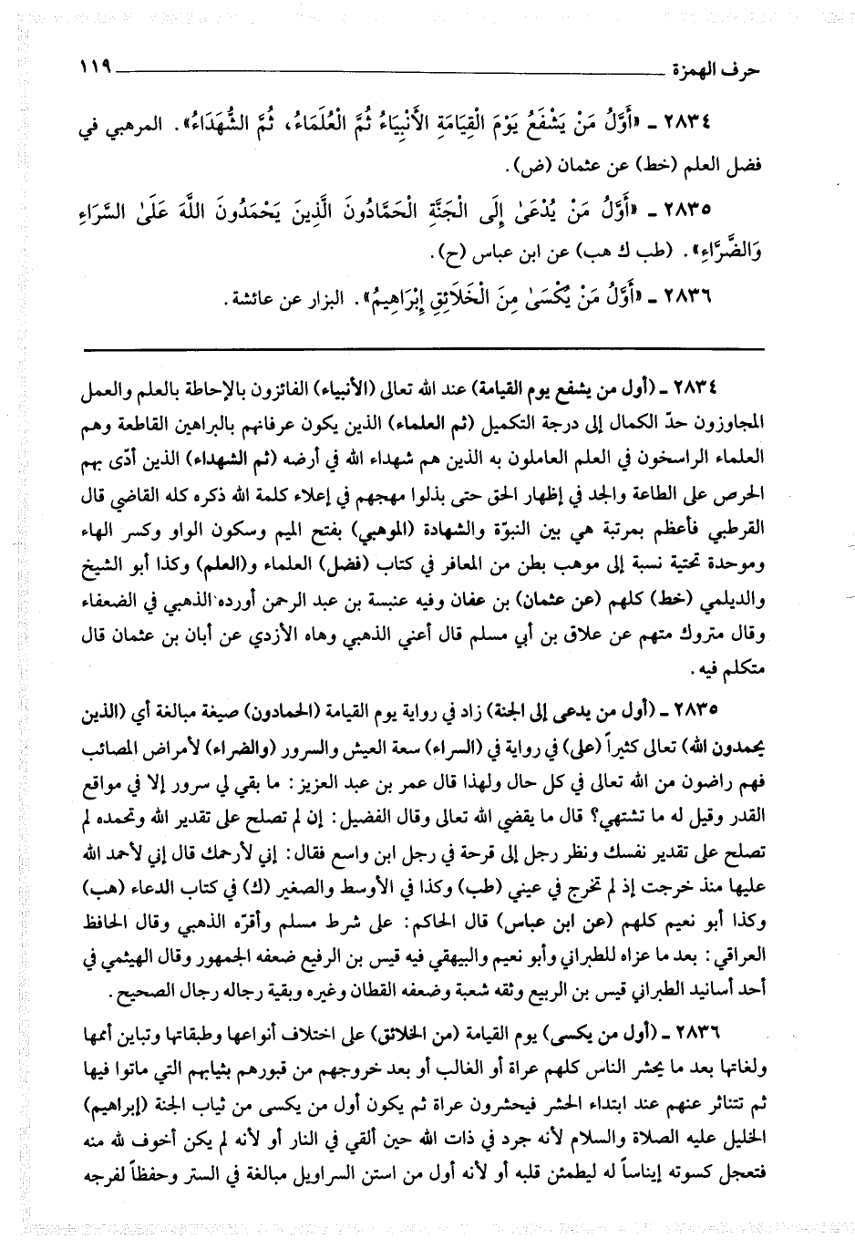 2834 (أول من يشفع يوم القيامة) عند الله تعالى (الأنبياء) الفائزون بالإحاطة بالعلم والعمل المجاوزون حد الكمال إلى درجة التكميل (ثم العلماء) الذين يكون عرفانهم بالبراهين القاطعة وهم العلماء الراسخون في العلم العاملون به الذين هم شهداء الله في أرضه (ثم الشهداء) الذين أدى بهم الحرص على الطاعة والجد في إظهار الحق حتى بذلوا مهجهم في إعلاء كلمة الله ذكره كله القاضي قال القرطبي : فأعظم بمرتبة هي بين النبوة والشهادة.