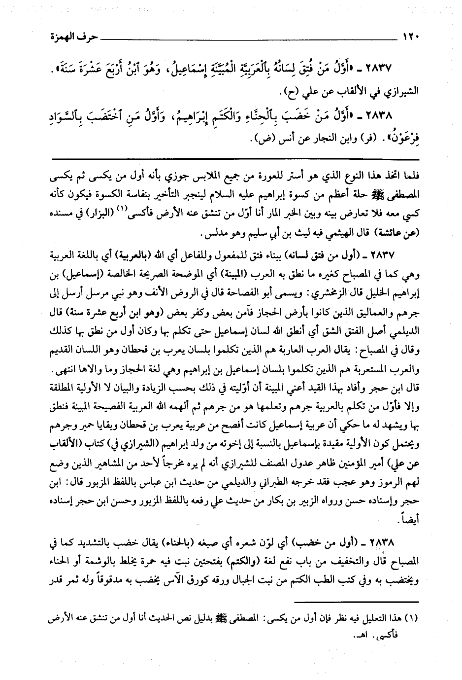 قال ابن حجر : وأفاد بهذا القيد أعني المبينة أوليته في ذلك بحسب الزيادة والبيان لا الأولية المطلقة وإلا فأول من تكلم بالعربية جرهم وتعلمها هو من جرهم ثم ألهمه الله العربية الفصيحة المبينة فنطق بها ويشهد له ما حكي أن عربية إسماعيل كانت أفصح من عربية يعرب بن قحطان وبقايا حمير وجرهم ويحتمل كون الأولية مقيدة بإسماعيل بالنسبة إلى إخوته من ولد إبراهيم (الشيرازي) في كتاب (الألقاب عن علي) أمير المؤمنين ظاهر عدول المصنف للشيرازي أنه لم يره مخرجا لأحد من المشاهير الذين وضع لهم الرموز وهو عجب فقد خرجه الطبراني والديلمي من حديث ابن عباس باللفظ المزبور قال ابن حجر : وإسناده حسن ورواه الزبير بن بكارمن حديث علي رفعه باللفظ المزبور وحسن ابن حجر إسناده أيضا.