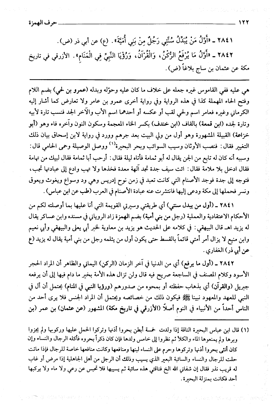 الكرماني وغيره فعامر اسم ولحي لقب أو عكسه أو أحدهما اسم الأب والآخر الجد فنسب تارة لأبيه وتارة لجده (ابن قمعة) بالقاف (ابن خندف) بكسر الخاء المعجمة وسكون النون وآخره فاء وهو (أبو خزاعة) القبيلة المشهورة وهو أول من ولي البيت بعد جرهم وورد في رواية لابن إسحاق بيان ذلك التغيير فقال : فنصب الأوثان وسيب السوائب وبحر البحيرة (1) ووصل الوصيلة وحمى الحامي قال : وسببه أنه كان له تابع من الجن يقال له أبو ثمامة فأتاه ليلة فقال : أرحب أبا ثمامة فقال : لبيك من تهامة فقال : ادخل بلا ملامة فقال : ائت سيف جدة تجد آلهة معدة فخذها ولا تهب وادع إلى عبادتها تجب ، فتوجه إلى جدة فوجد الأصنام التي كانت تعبد في زمن نوح وإدريس وهي ود وسواع ويغوث ويعوق ونسر فحملها إلى مكة ودعا إليها فانتشر ت عنه عبادة الأصنام في العرب (طب عن ابن عباس).