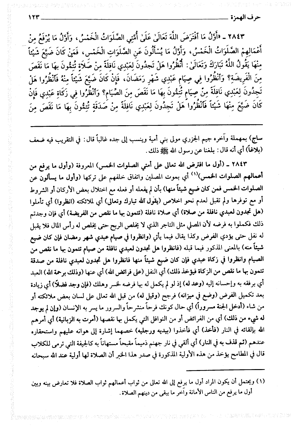 ساج) بمهملة وآخره جيم الجزري مولى بني أمية وينسب إلى جده غالبا قال في التقريب : فيه ضعف (بلاغا) أي أنه قال : بلغنا عن رسول الله صلى الله عليه وسلم ذلك 2843 (أول ما افترض الله تعالى على أمتي الصلوات الخمس) المعروفة (وأول ما يرفع من أعمالهم الصلوات الخمس (1) أي بموت المصلين واتفاق خلفهم على تركها (وأول ما يسئلون عن الصلوات الخمس فمن كان ضيع شيئا منها) بأن لم يفعله أو فعله مع اختلال بعض الأركان أو الشروط أو مع توفرها ولم تقبل لعدم نحو إخلاص (يقول الله تبارك وتعالى) أي لملائكته (انظروا) أي تأملوا (هل تجدون لعبدي نافلة من الصلاة) أي صلاة نافلة (تتمون بها ما نقص من الفريضة) أي فإن وجدتم ذلك فكملوا به فرضه لأن المصلي مثل التاجر الذي لا يخلص الربح حتى يخلص له رأس المال فلا يقبل له نفل حتى يؤدي الفرض وكذا يقال فيما يأتي (وانظروا في صيام عبدي شهر رمضان فإن كان ضيع شيئا منه) بالمعنى المذكور فيما قبله (فانظروا هل تجدون لعبدي نافلة من صيام تتمون منها ما نقص من صيام وانظروا في زكاة عبدي فإن كان ضيع شيئا منها فانظروا هل تجدون لعبدي نافلة من صدقة تتمون بها ما نقص من الزكاة فيؤخذ ذلك) أي النفل (على فرائض الله) أي عنها (وذلك برحمة الله) العبد أي برفقه به وإحسانه إليه (وعدله) إذ لو لم يكمل له بها فرضه لخسر وهلك (فإن وجد فضلا) أي زيادة بعد تكميل الفرض (وضع في ميزانه) فرجح (وقيل له) من قبل الله تعالى على لسان بعض ملائكته أو من شاء (ادخل الجنة مسرورا) أي حال كونك فرحا منشرحا والسرور ما يسر به الإنسان (وإن لم يوجد